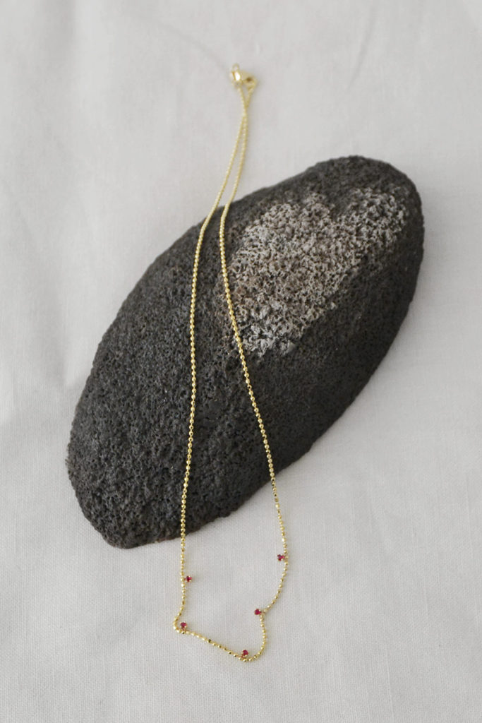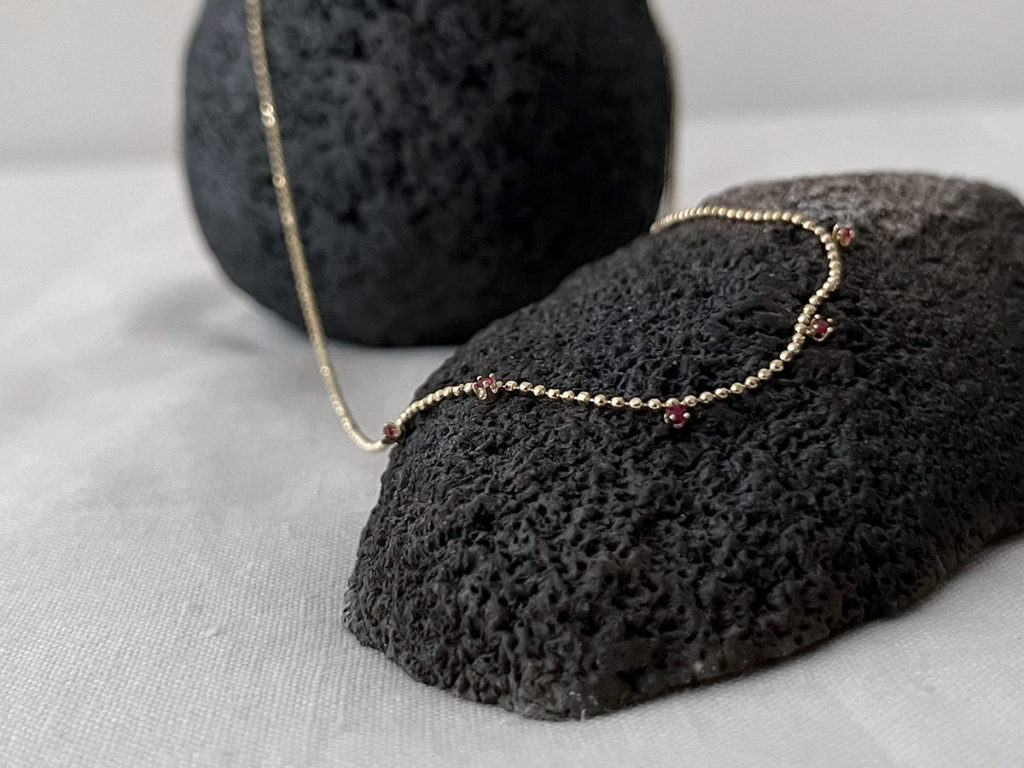 素材:14Kゴールド(ビーズチェーン ビーズ約1.2㎜), AAAグレード ルビー(約1.5㎜)