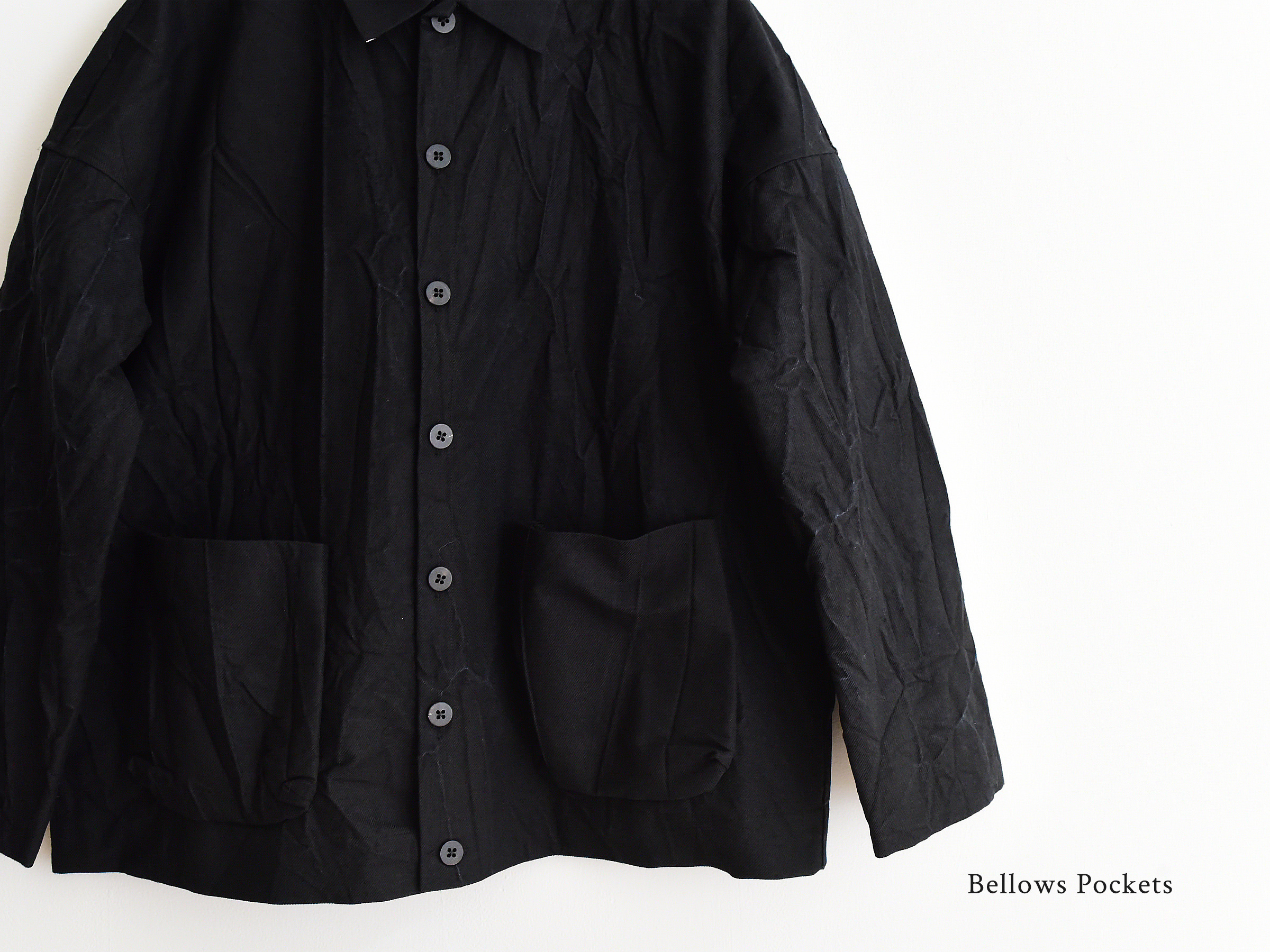 ※丈夫なキャンバス生地を使用したジャケット。ウォッシュ加工により自然なシワ感を演出。フロントには大きなベローズポケットが2つ付いています。