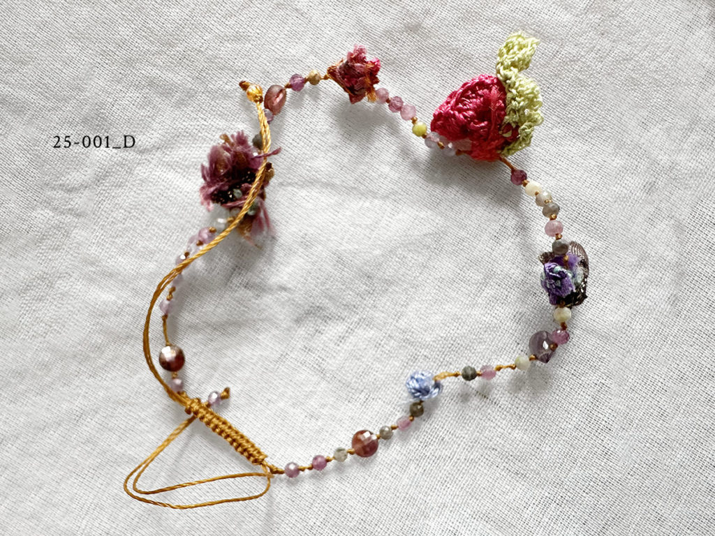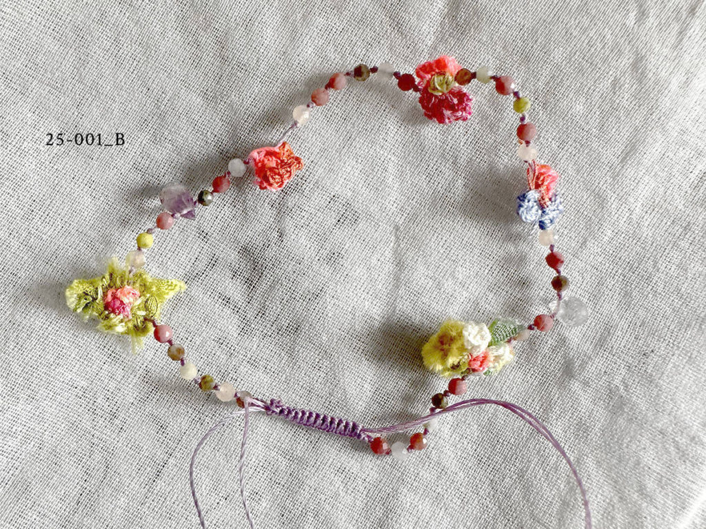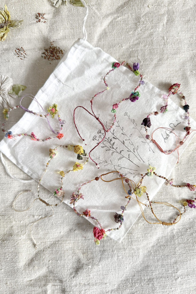 ブレスレットはシルク、リネン、ラミの生地、ベネチアンビーズや天然の半貴石などを使い作られています。