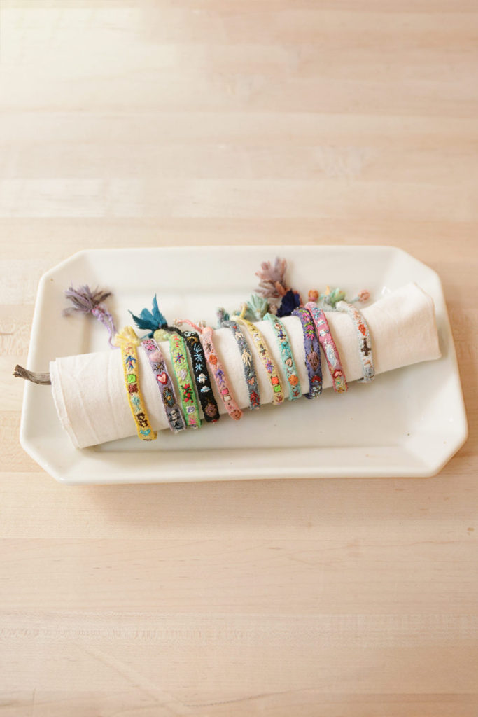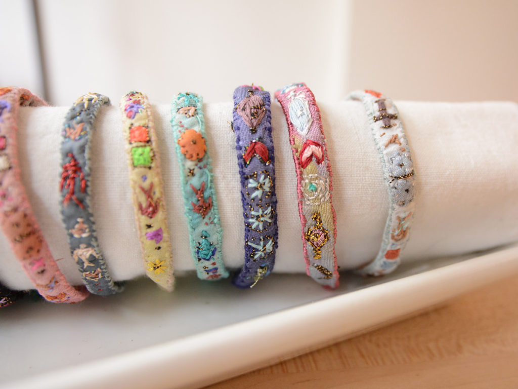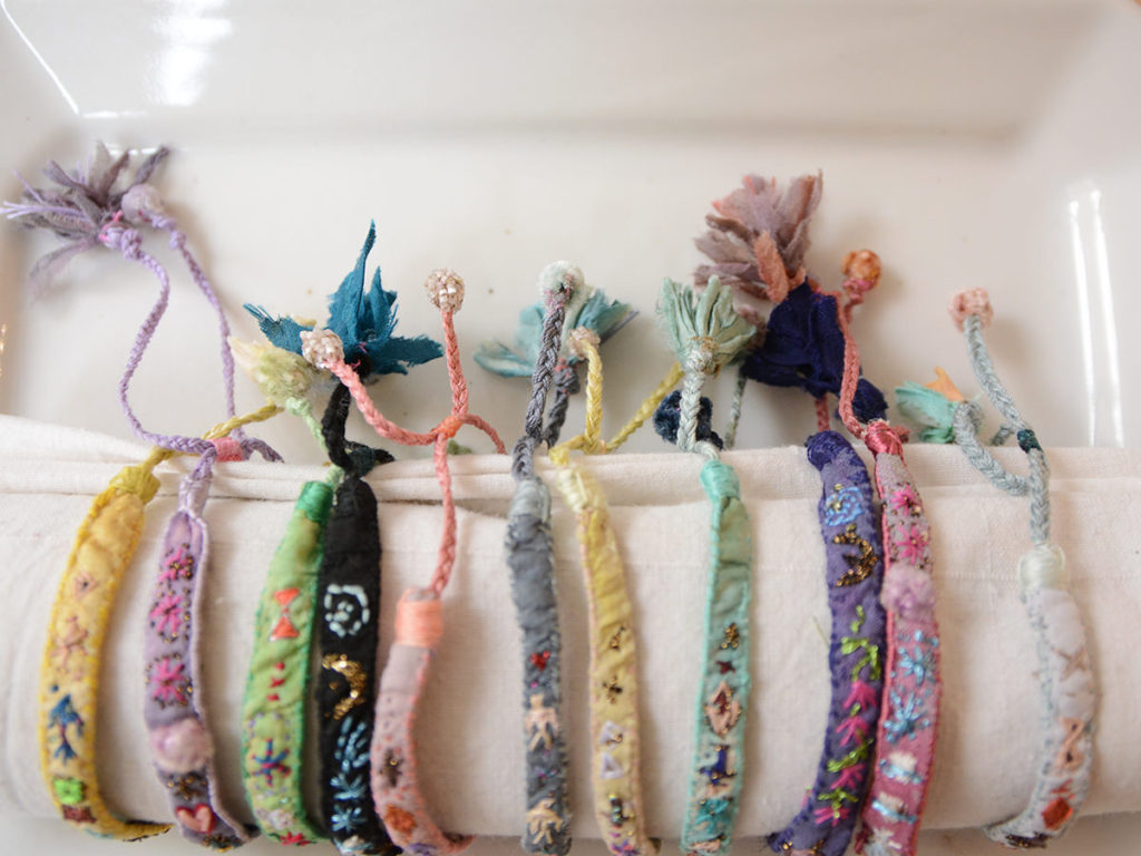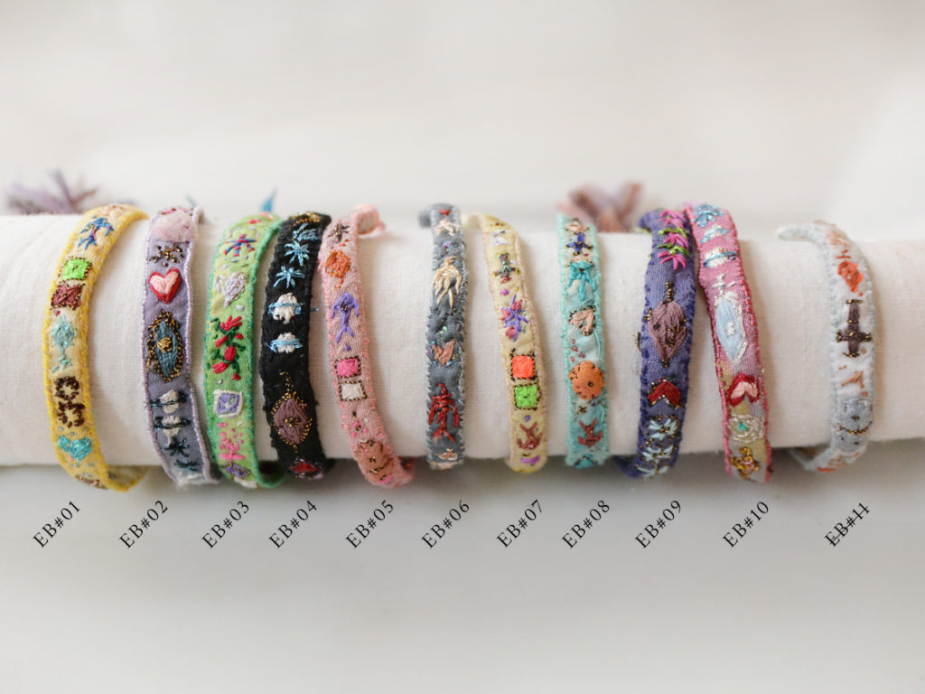 ブレスレットはシルク、リネン、ラミの生地、ベネチアンビーズや天然の半貴石などを使い作られています。