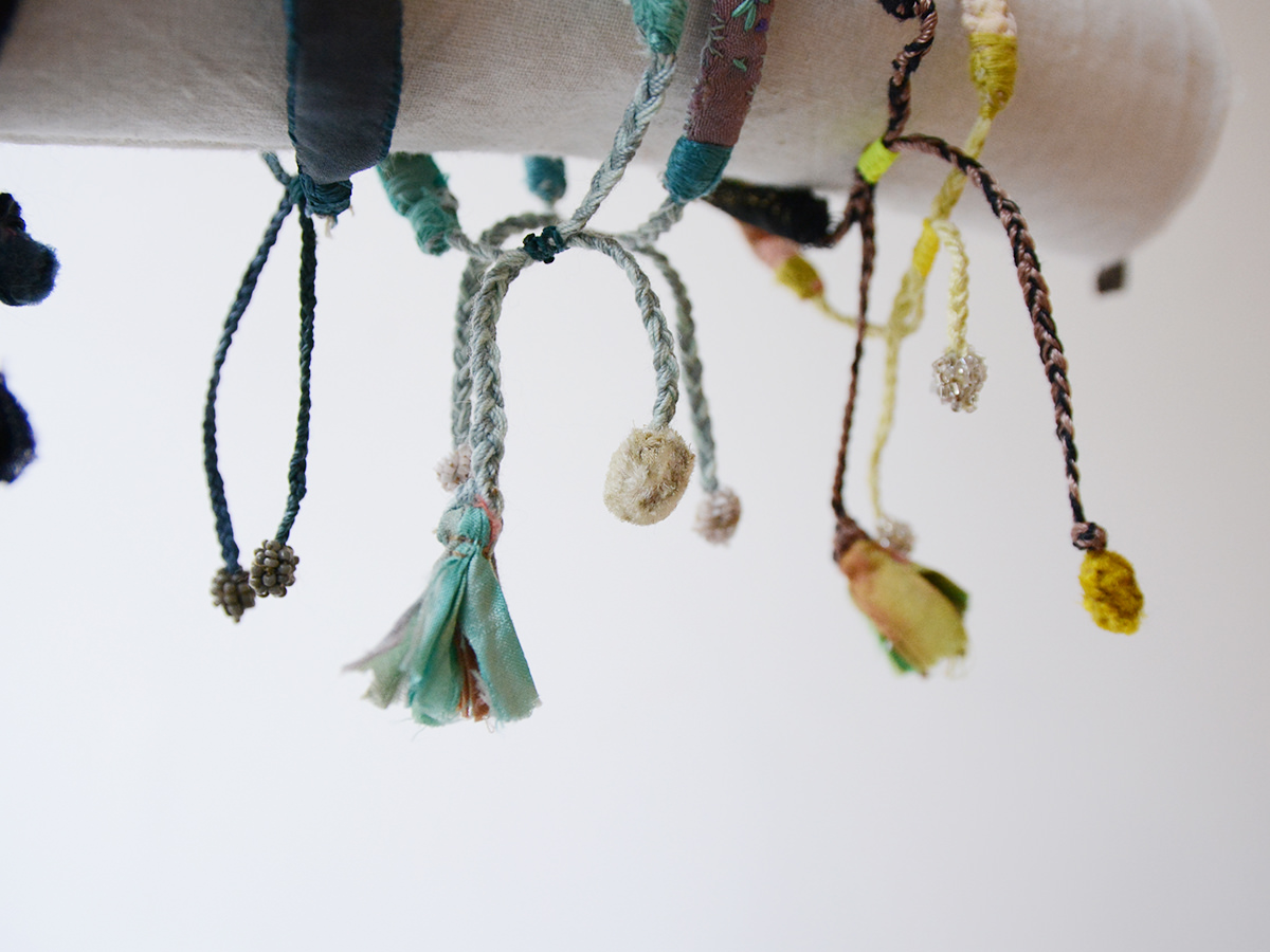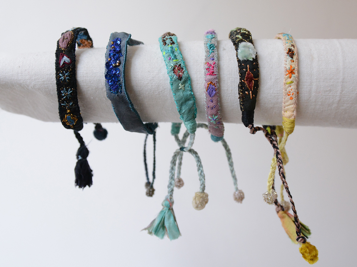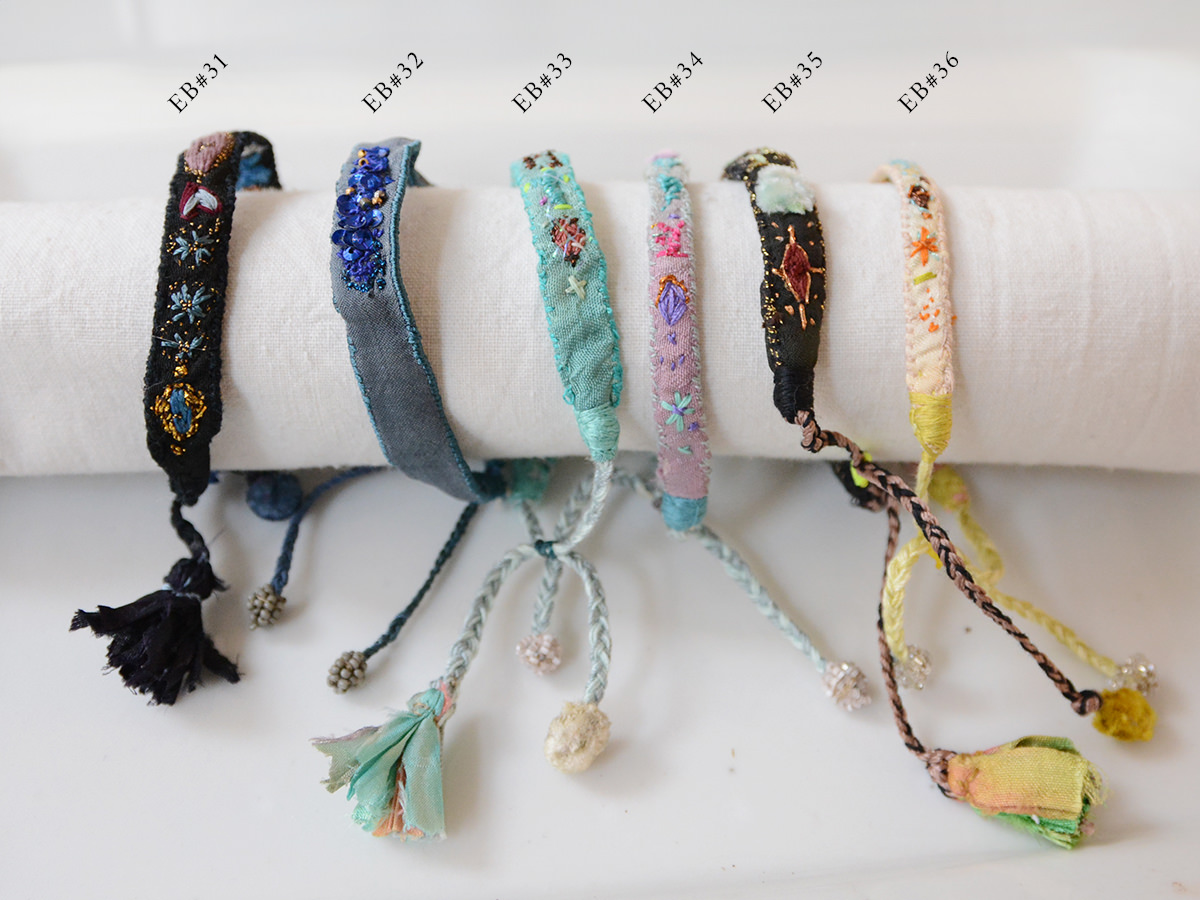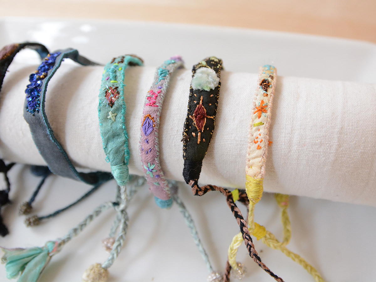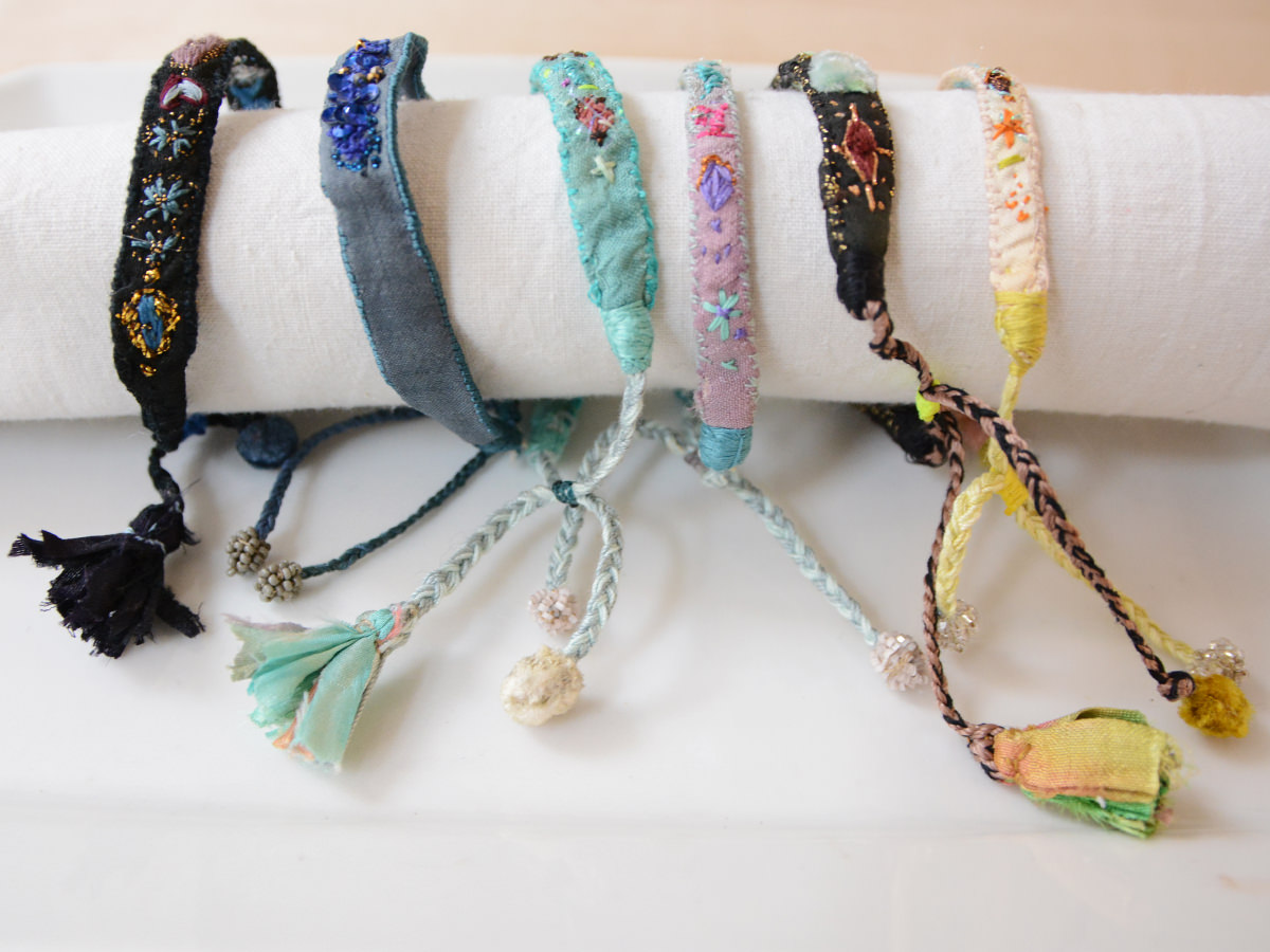 ブレスレットはシルク、リネン、ラミの生地、ベネチアンビーズや天然の半貴石などを使い作られています。
