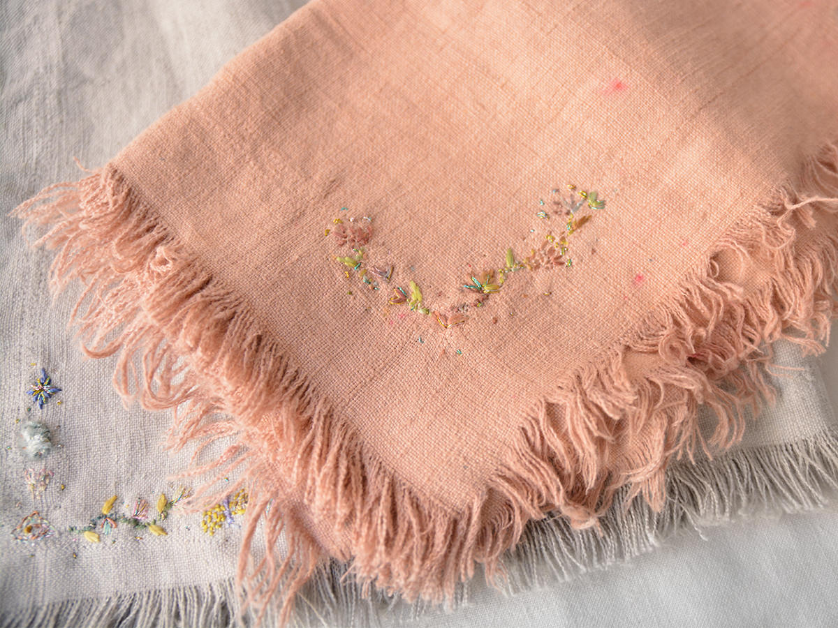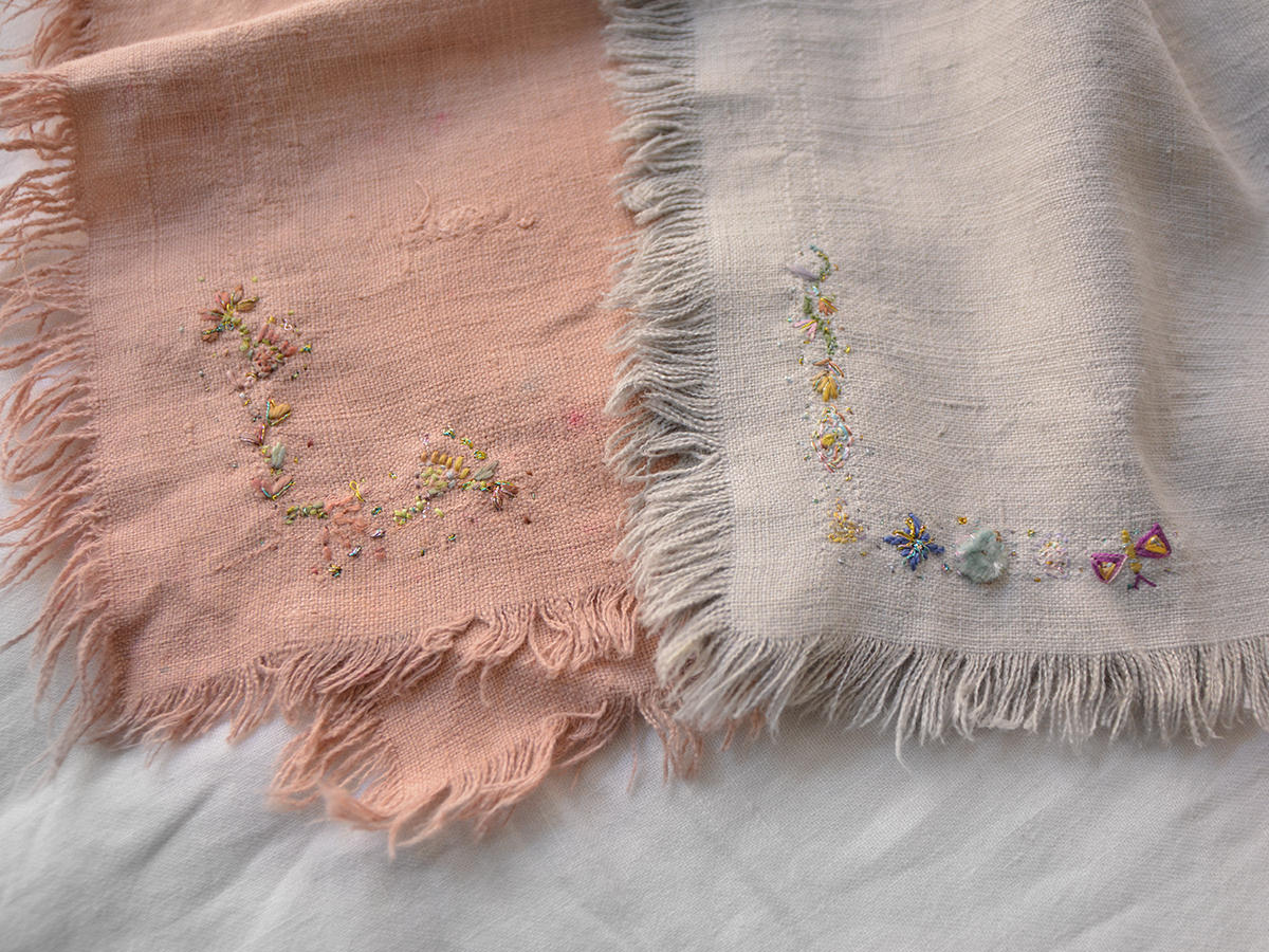 イタリアのボローニャで活動するアーティスト、 Antonia Rossi による刺繍入りのヴィンテージリネンナプキンです。