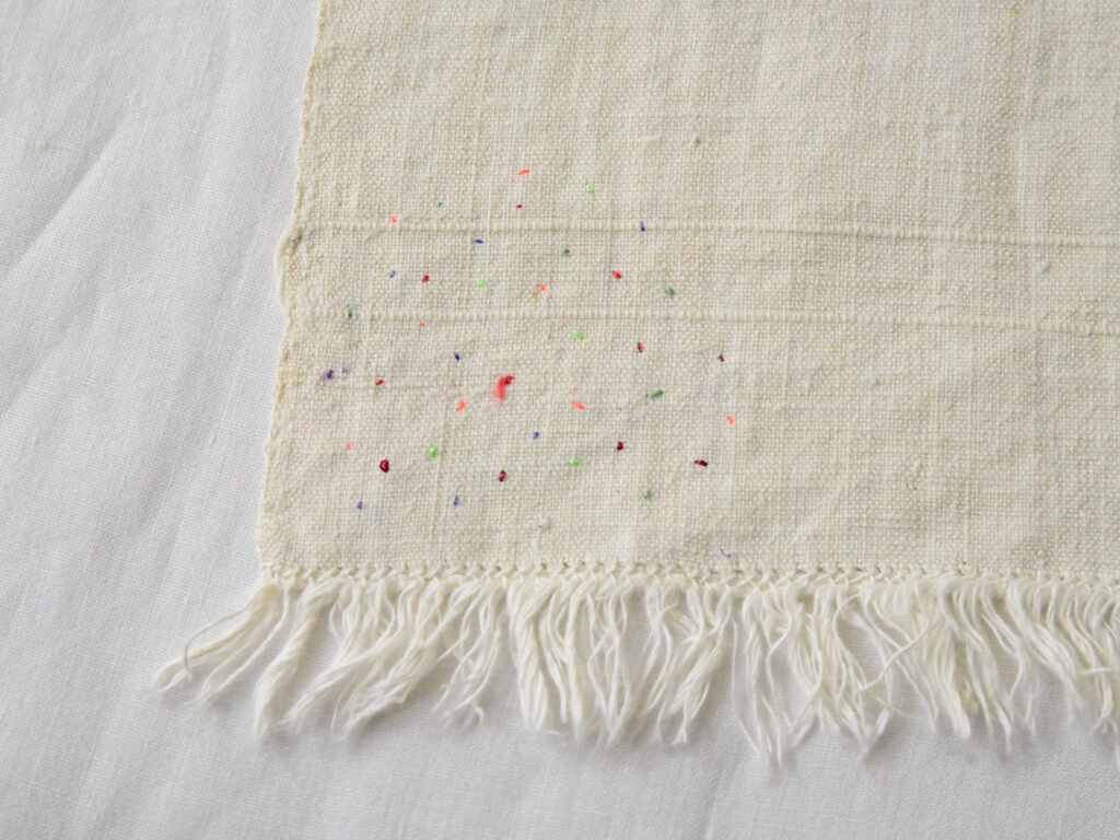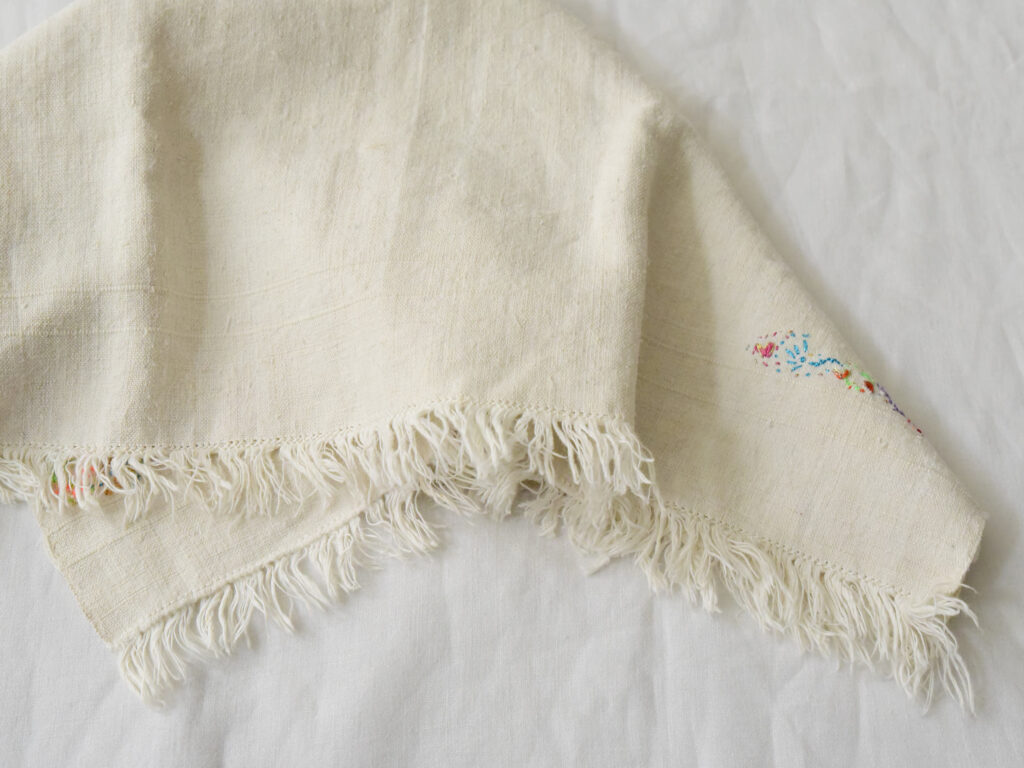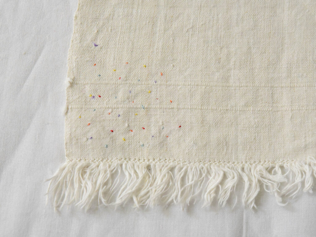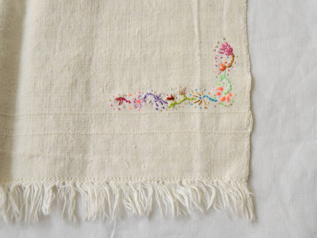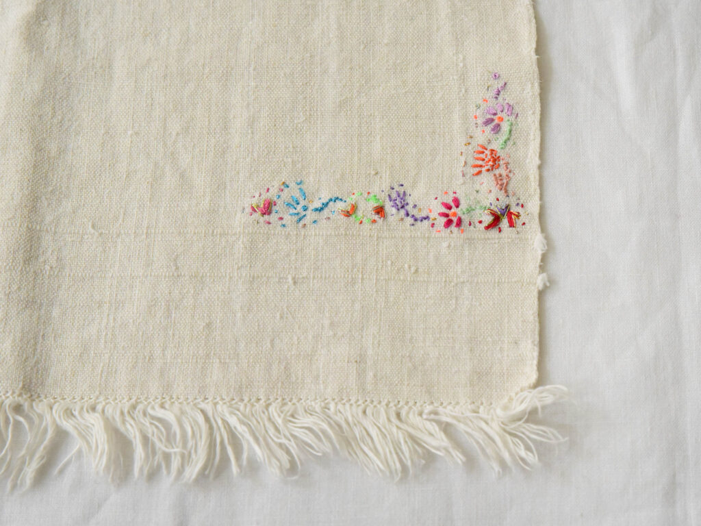 ヴィンテージリネンナプキンに刺繍を施しました。2つの角に花のモチーフ、残りの2つの角にカラフルな星のようなドット刺繍が施されたリネンナプキンです。