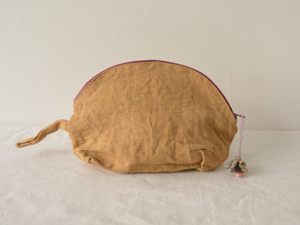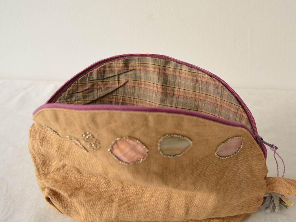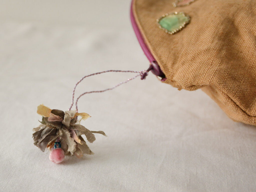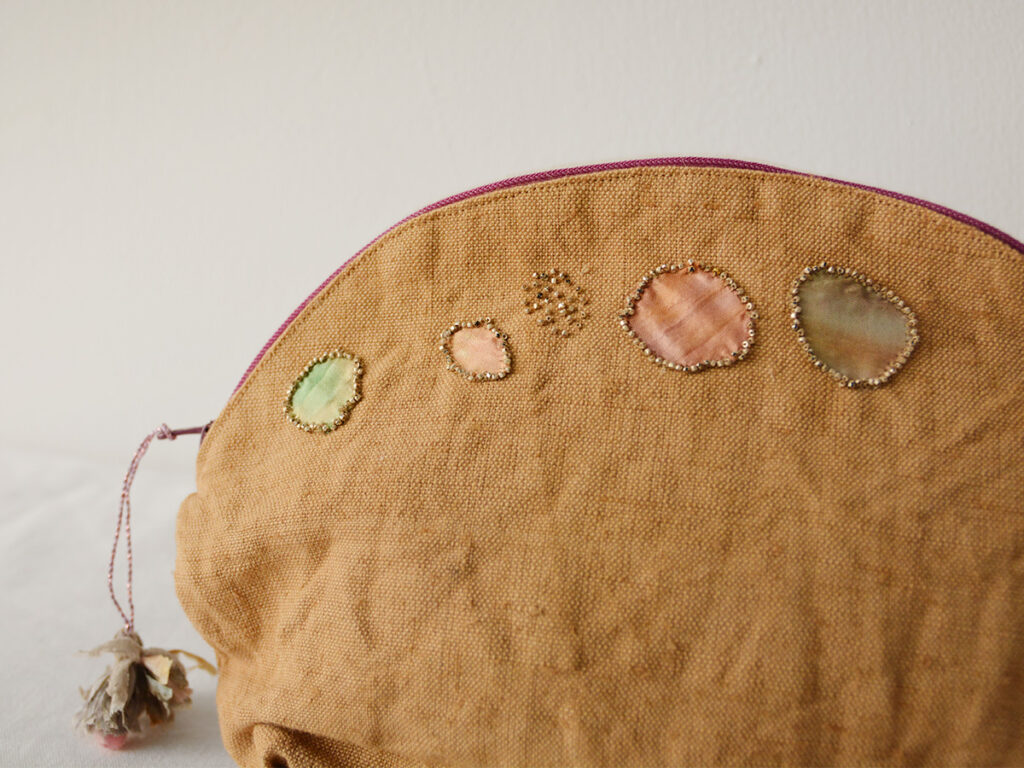 ビンテージの布、手染めのリネンやベネチアンビーズ、ジッパーを使用して作られています。