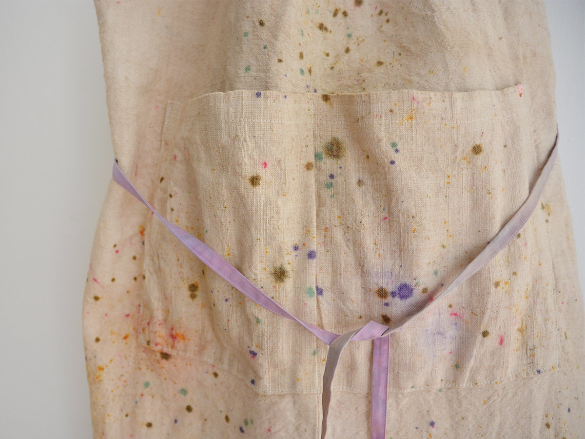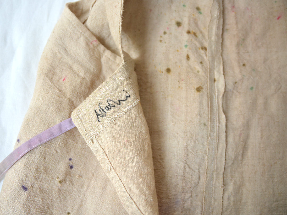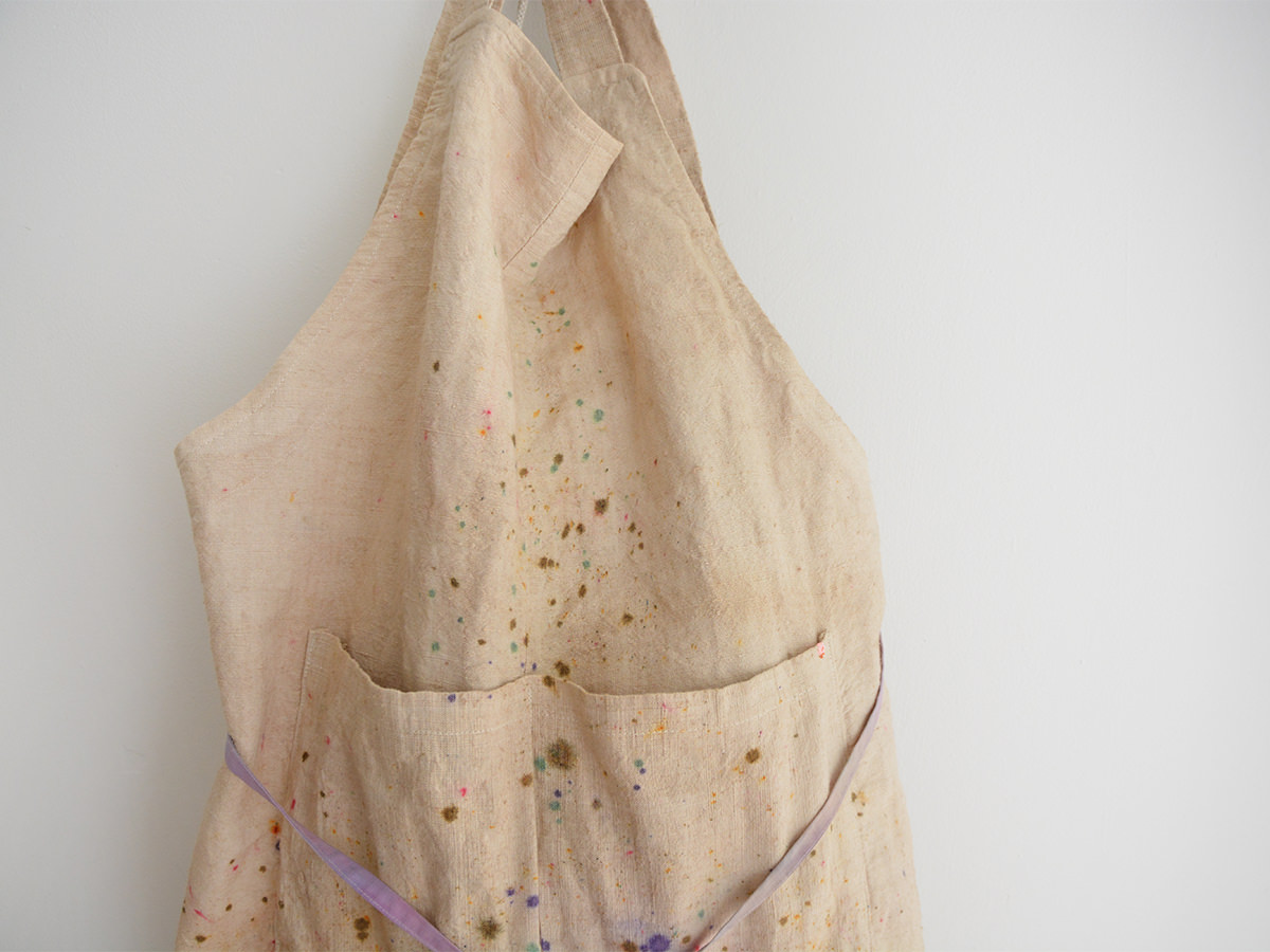 アーティストの手作業制作によるエプロンですので、シミや傷などがあるものもございますが、それぞれの個性であることをご了承ください。 使用されている素材や生地はとてもデリケートなものになりますので、お取り扱いには十分ご注意ください。