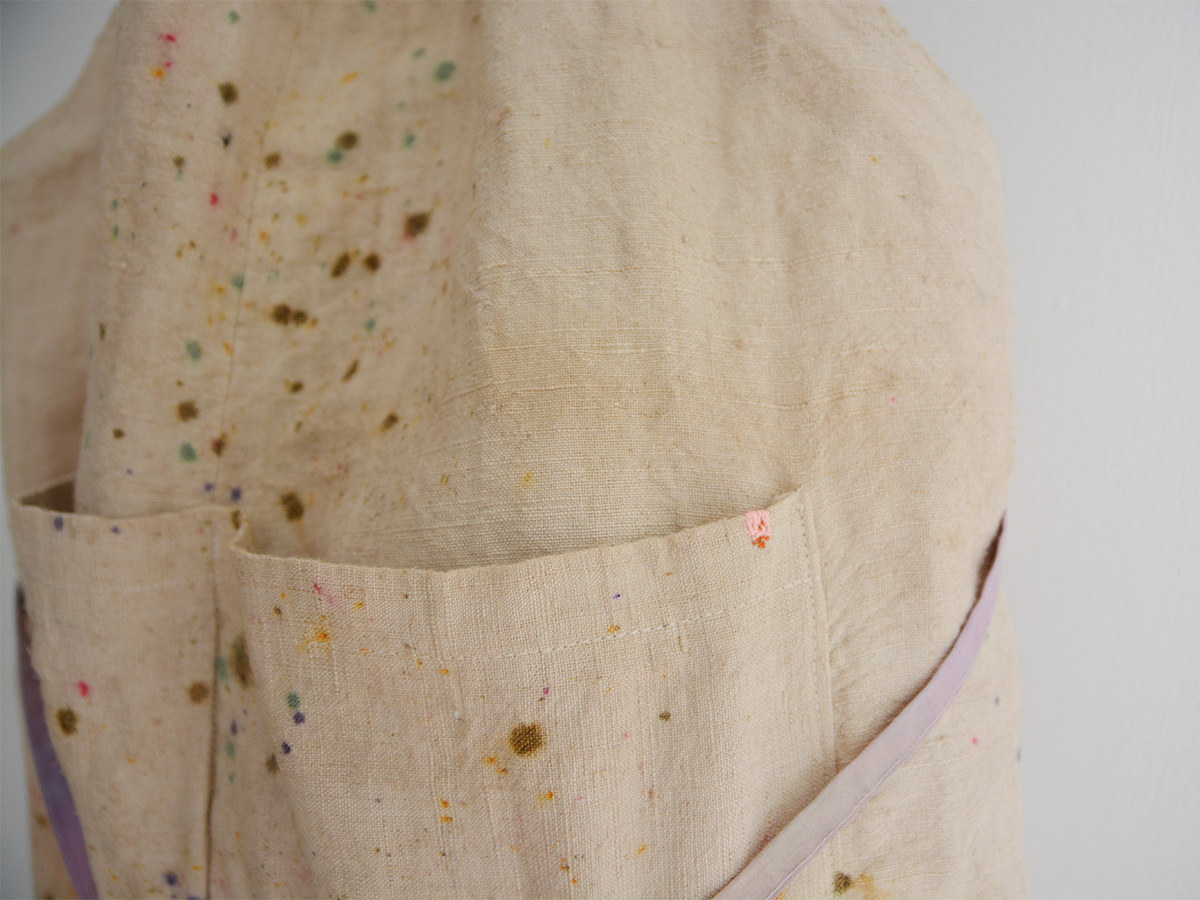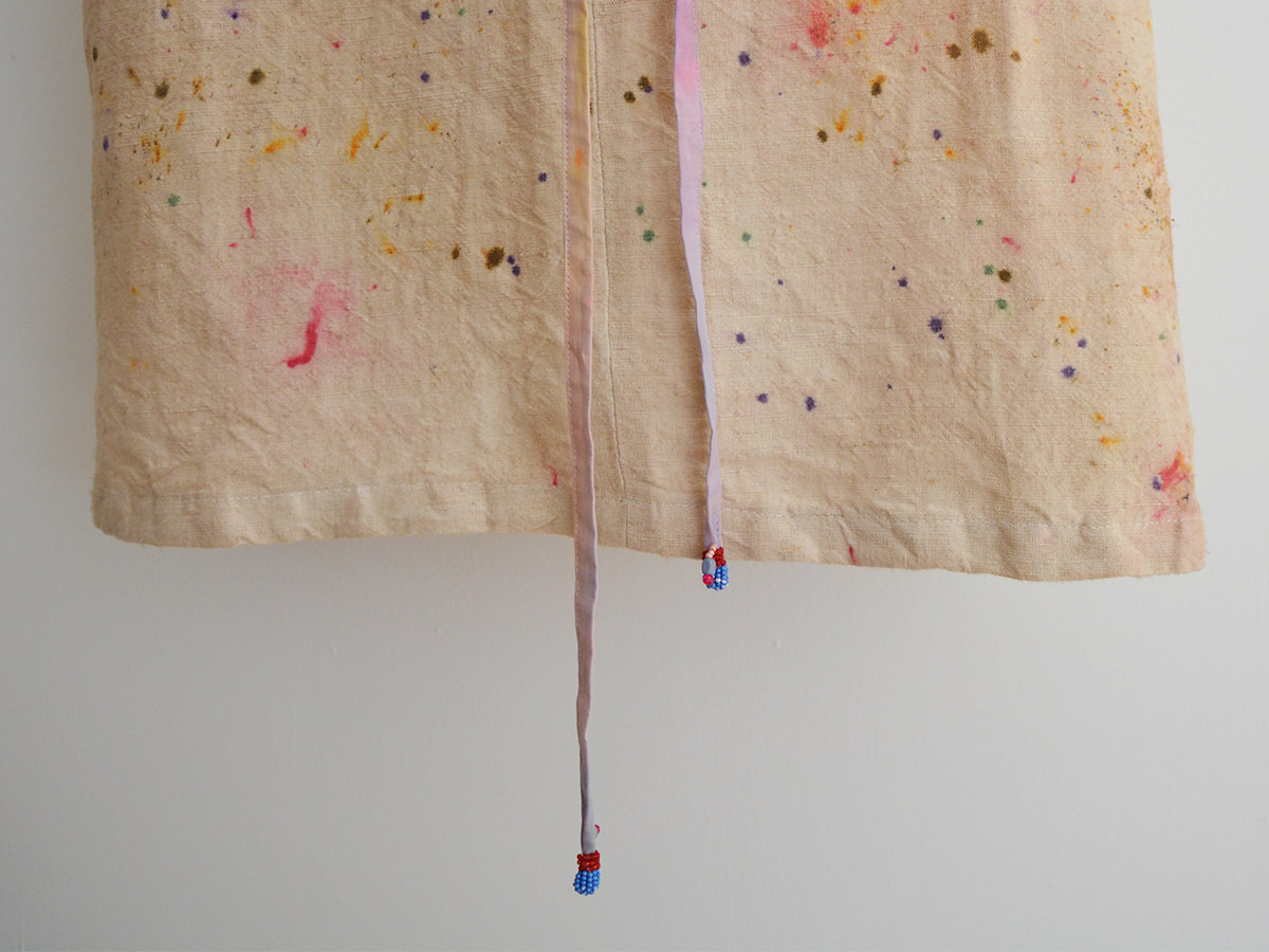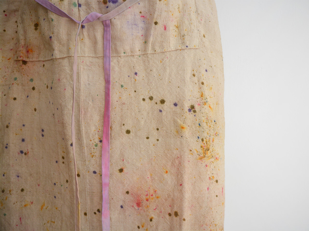 アーティストの手作業制作によるエプロンですので、シミや傷などがあるものもございますが、それぞれの個性であることをご了承ください。 使用されている素材や生地はとてもデリケートなものになりますので、お取り扱いには十分ご注意ください。