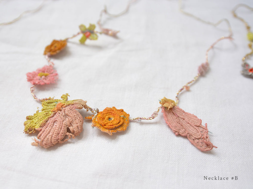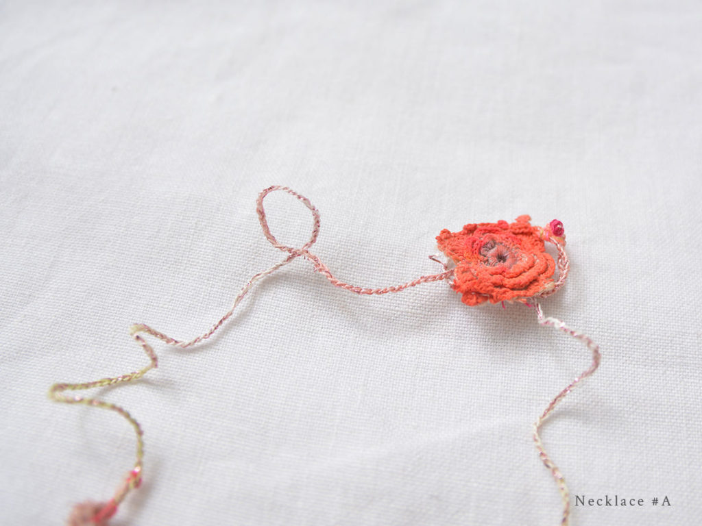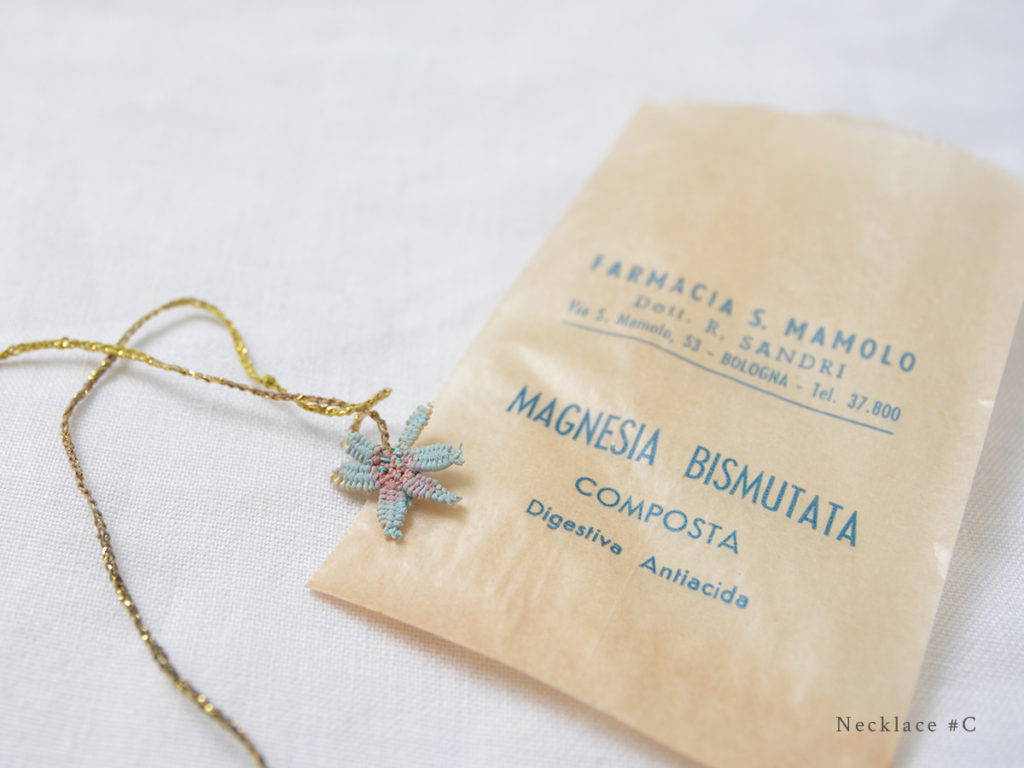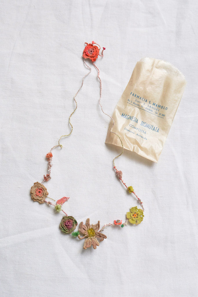 繊細な作品を作り出すイタリア人アーティスト。作品作りというものはとても内面的なもので、縫い物をするときの祈りのようなもの。一つ一つそれぞれに思い、その時感じた光が込められていて作品を作るのには時間がかかるのだそうです。使用している糸や、布、ビーズは彼女の友人の家族の遺品整理の時にいただいたり、ヴェニスの古い工場で古いビーズを見つけて来たりしているそうです。古い布を使ったサシェは彼女の故郷アブルッツォの伝統の一つで、赤ちゃんが生まれた時、中に祈りの言葉を入れる小さな袋を一生のお守りとしてプレゼントするそうです。この伝統を彼女なりにネックレスとして表現し、皆さんにお守りのように持ってもらいたいとの願いが込められています。