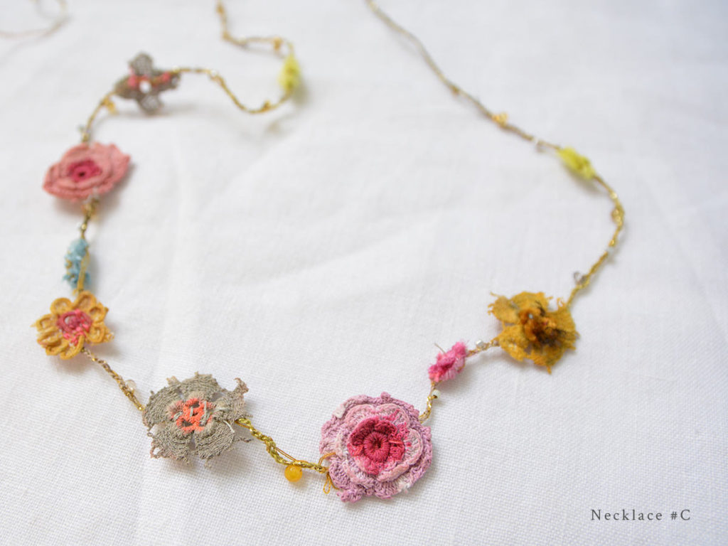 素材:ヴィンテージファブリック、ベネチアンビーズ、レース、糸(花刺繍)