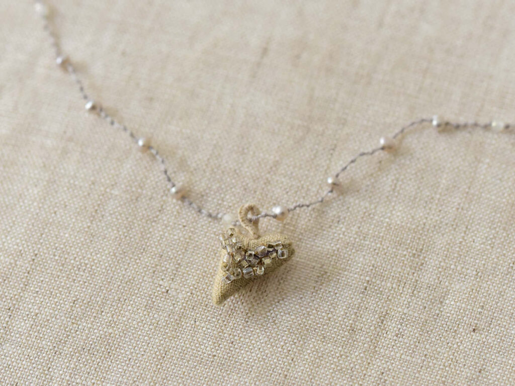 シルクやリネンの生地、ヴィンテージのベネチアンビーズで刺繍されたハートのネックレスです。