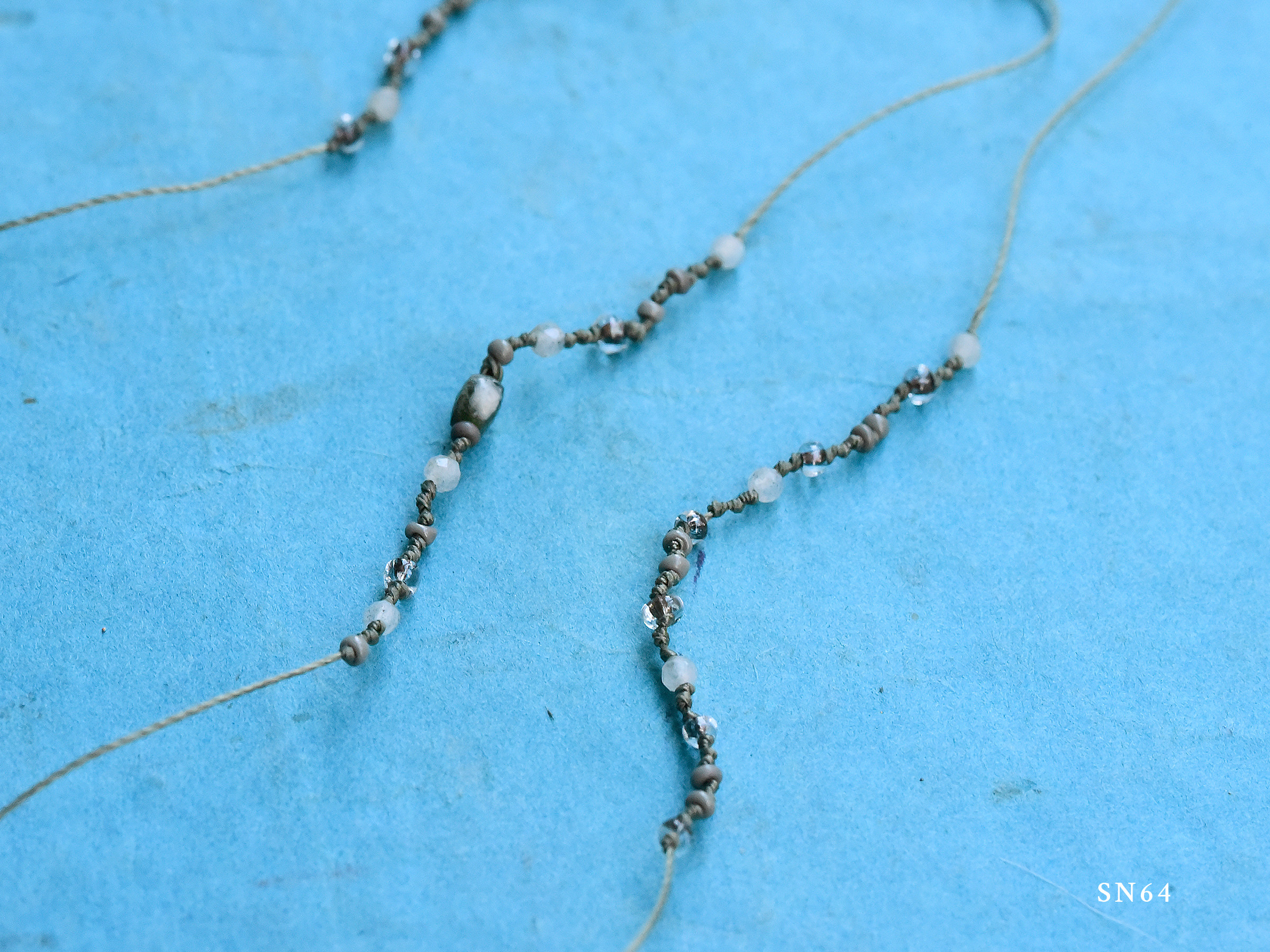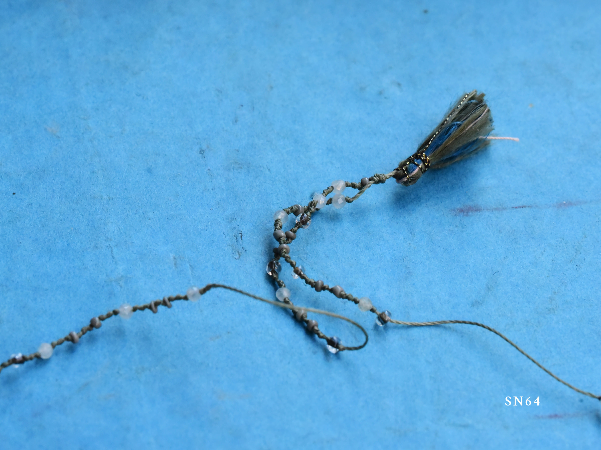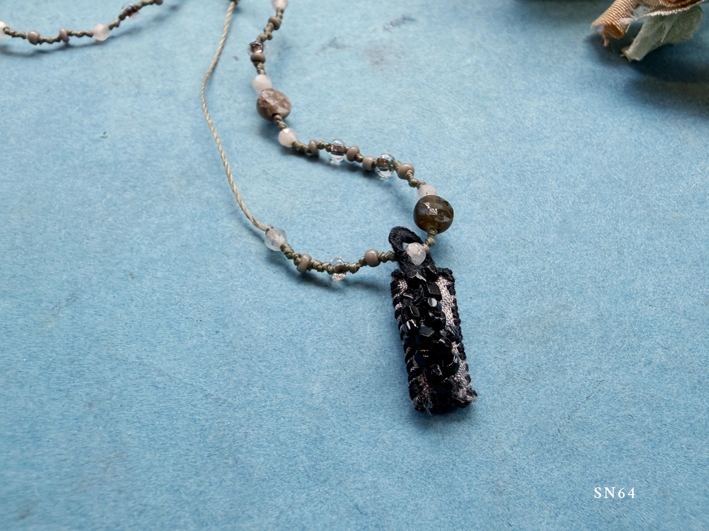 ビンテージの布やベネチアンビーズ、天然石などの天然のパーツ使用しているため、若干の傷や汚れなどがあるものもありますが、商品の個性であり、不良品ではありません。使われているパーツはとてもデリケートですので、濡らさないようお取り扱いには十分ご注意ください。