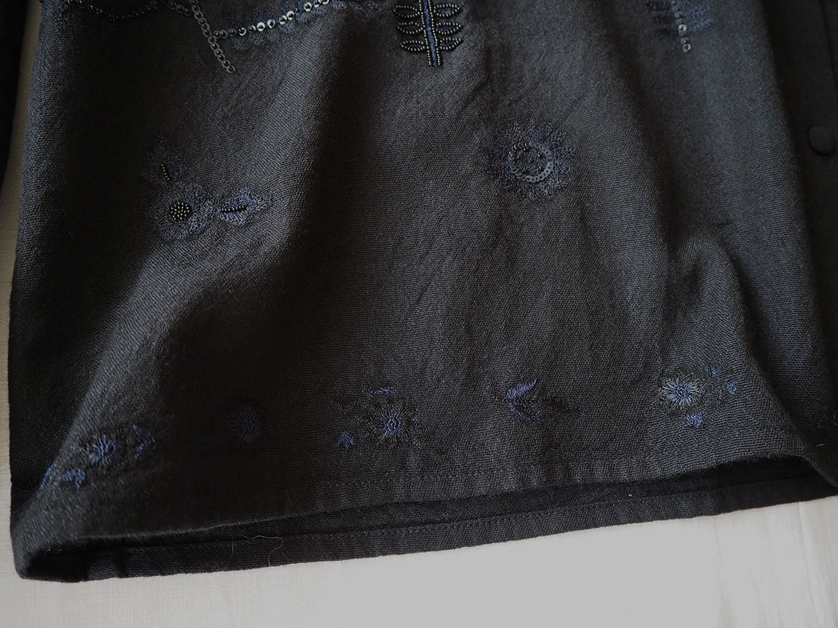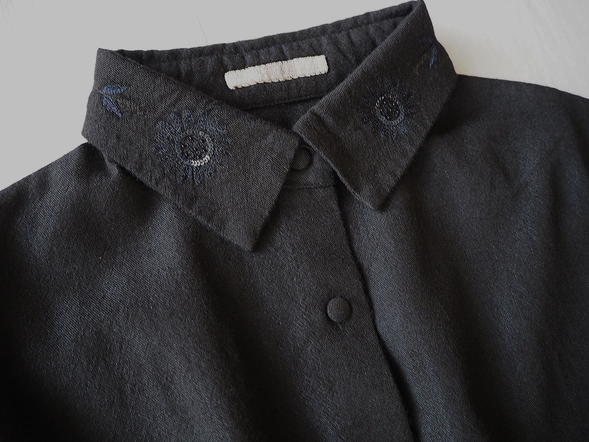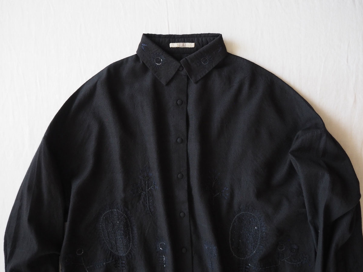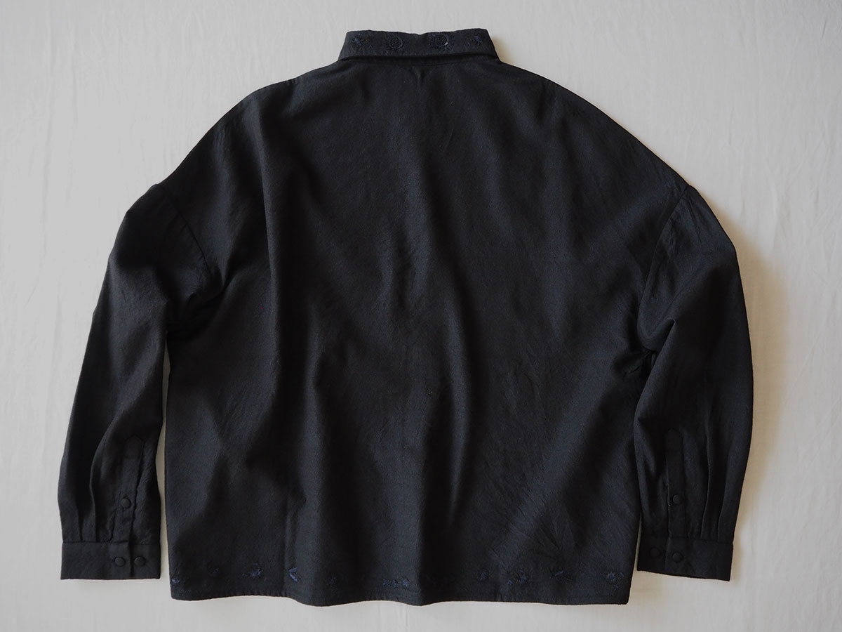 ウール生地にひまわりの刺繍入りのドロップショルダーのシャツです。