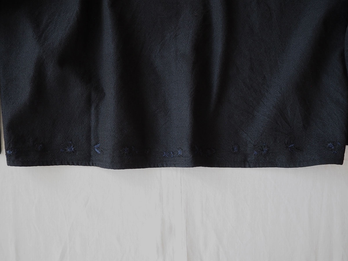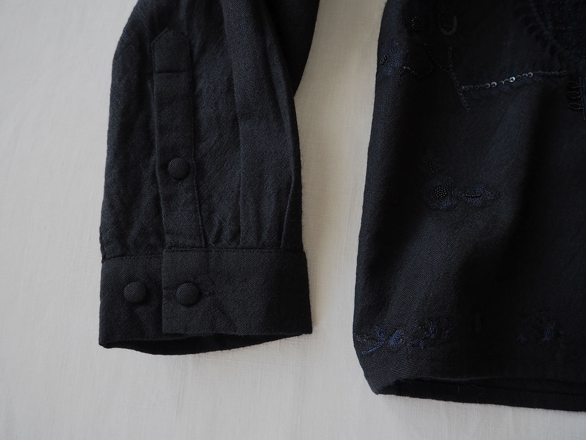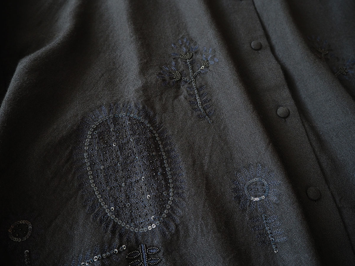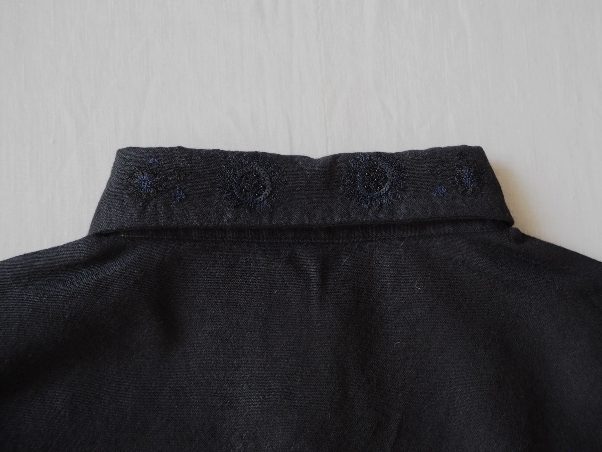 ウール生地にひまわりの刺繍入りのドロップショルダーのシャツです。