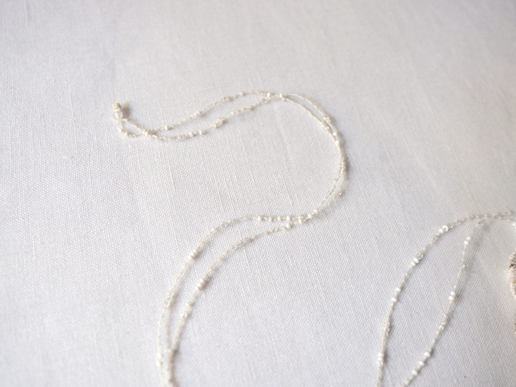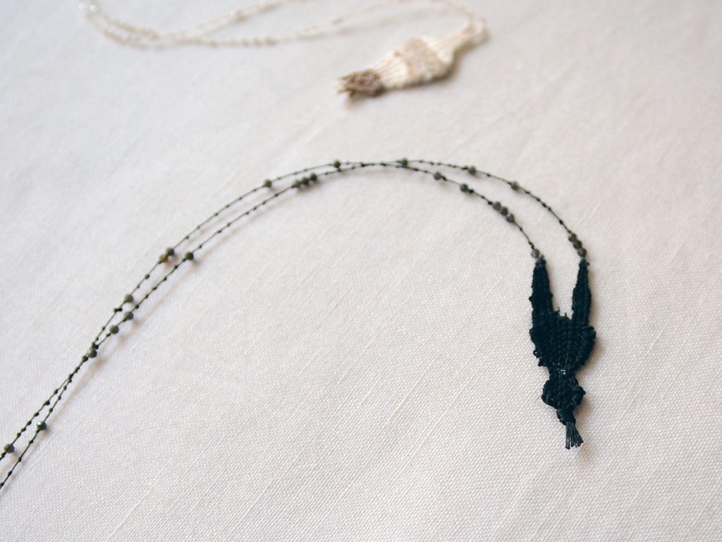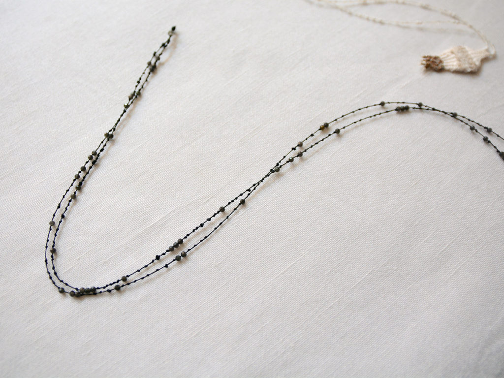 シルク、リネン、ラミ、細かなベネチアンビーズを使い、手織りで作られたネックレスです。