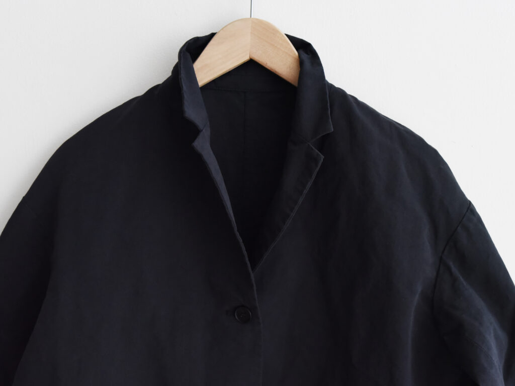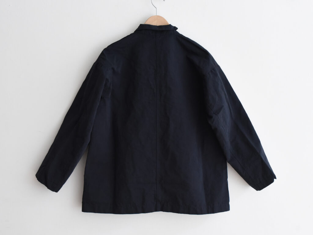 ※ベラジャケットは、イタリア製のコットンとリネンの混紡素材を使用し、深みのあるナイトカラーで仕上げられています。ゆったりとしたシルエットとドロップショルダーが特徴で、ボタン留めのすっきりとしたフロントデザインとさりげないポケットディテールが施されています。