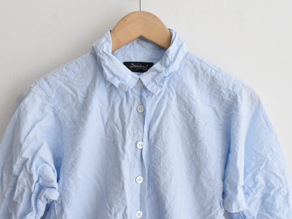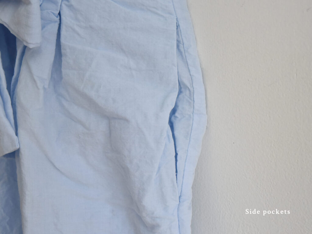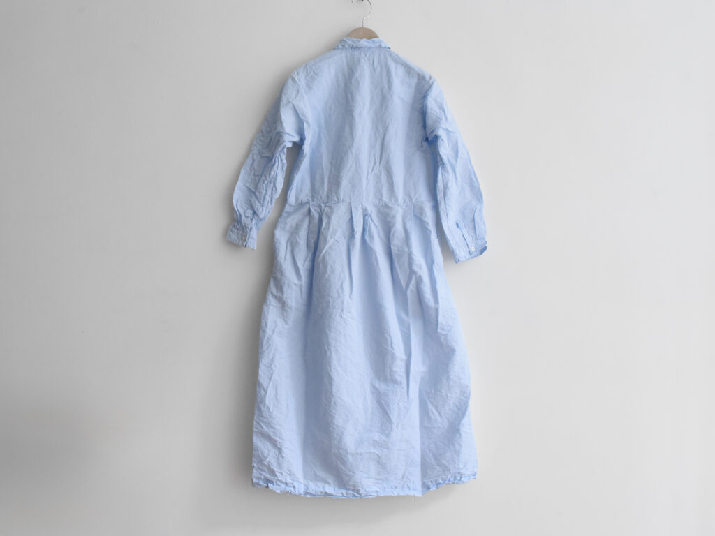 ※ディナドレスは、通気性の良いコットンとリネンの混紡素材を使用し、柔らかなブルーの色合いでイタリアで製造されています。ボタン留めの前開き、長袖、ウエストベルトのデザインです。