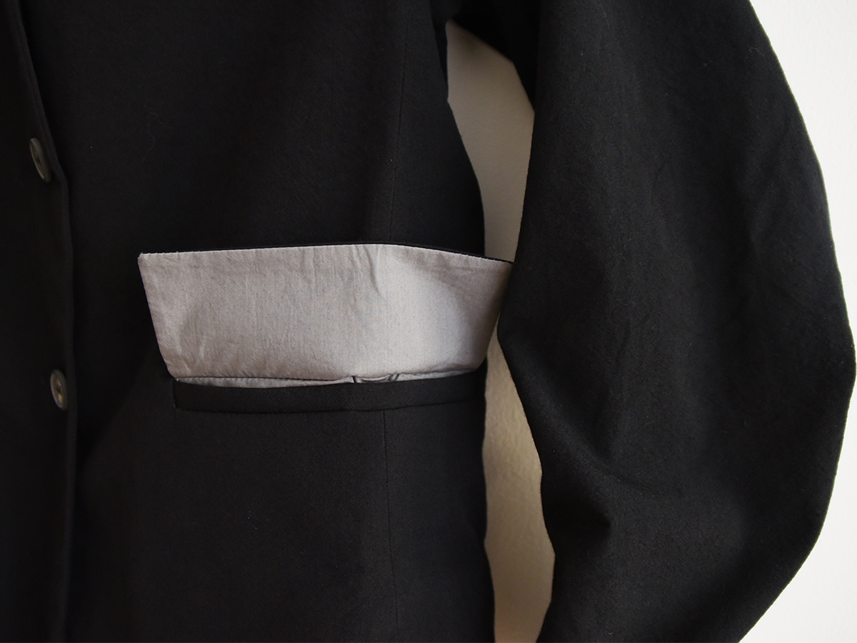 ※スリムフィット、2フロントポケット、1胸ポケット、後ろダブルベント