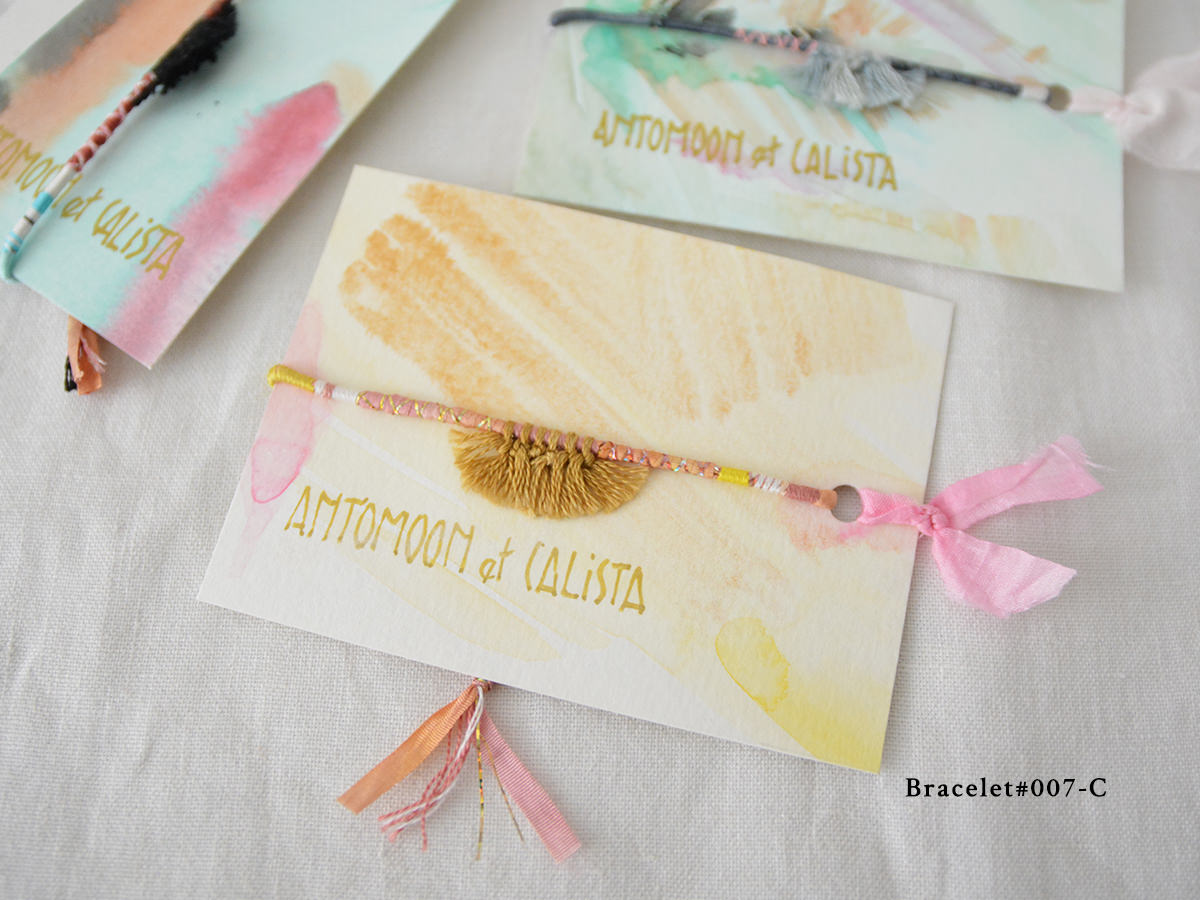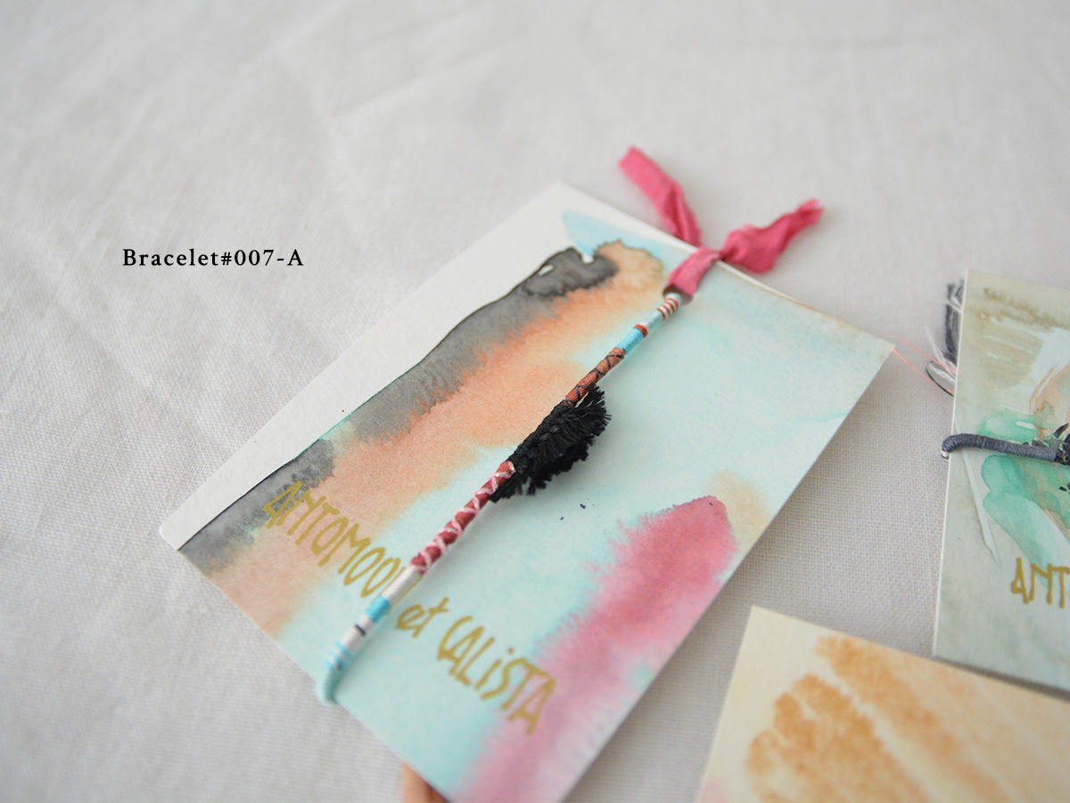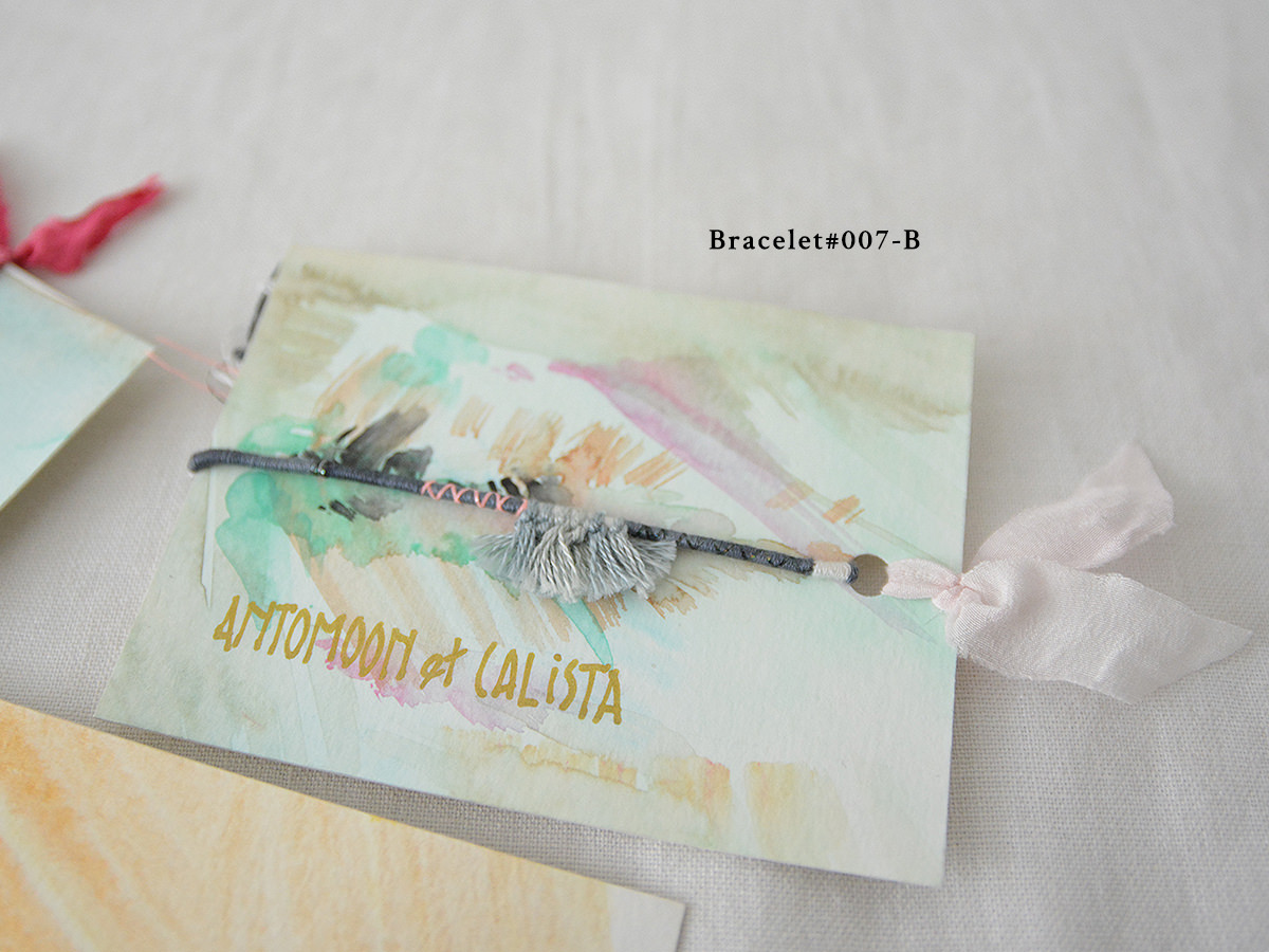 ブレスレットは、細く繊細な糸を使用して丁寧に手作りされており、裏側の水彩画はそれぞれ手書きで描かれているため唯一無二の作品になっています。
