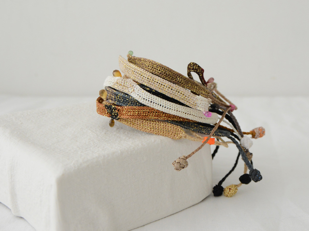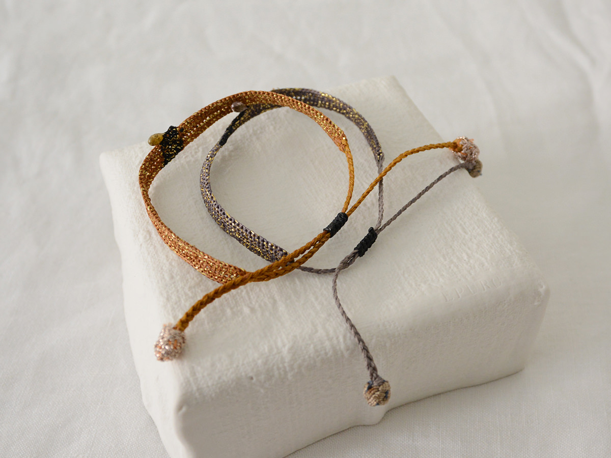ブレスレットは、シルクとトルマリンビーズ入りの金属糸で作られています。