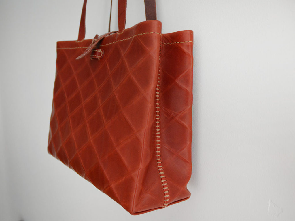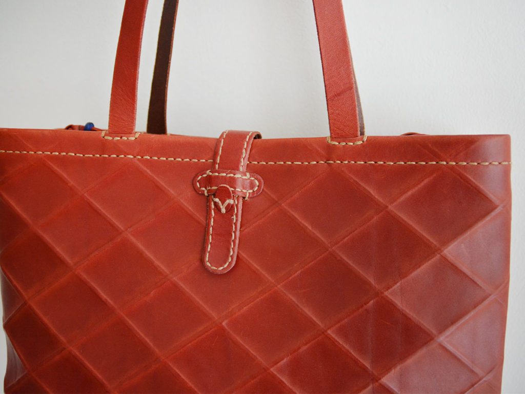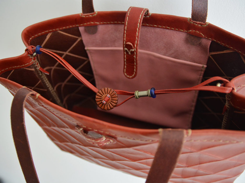 バッグを閉じるための革紐と横に閉じる紐が付いています。内ポケットあり。
