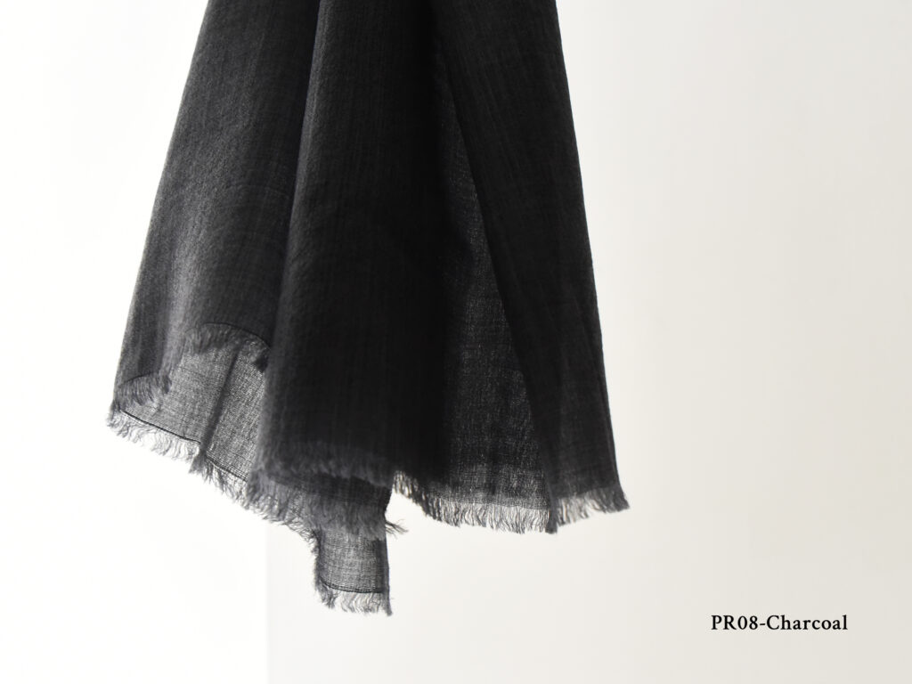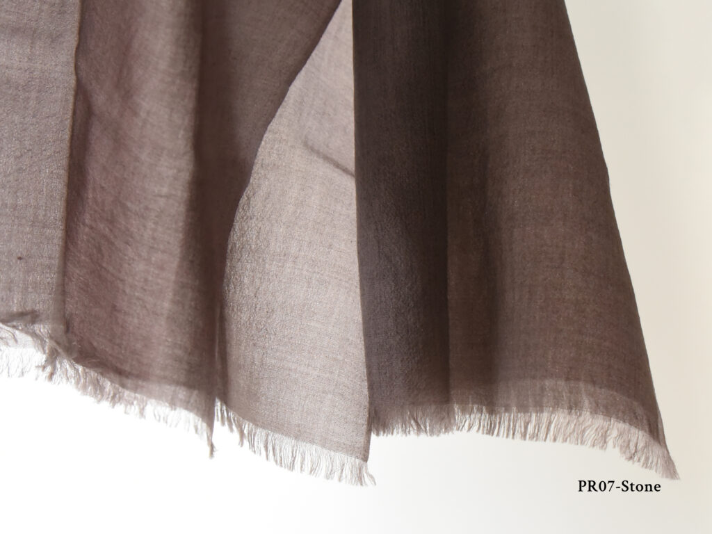 ※軽くて薄いカシミヤを使用し、プレウォッシュ加工でさらに柔らかな肌触りを実現。縁には短いフリンジが施され、大判サイズなので首に心地よく巻くのに最適です。