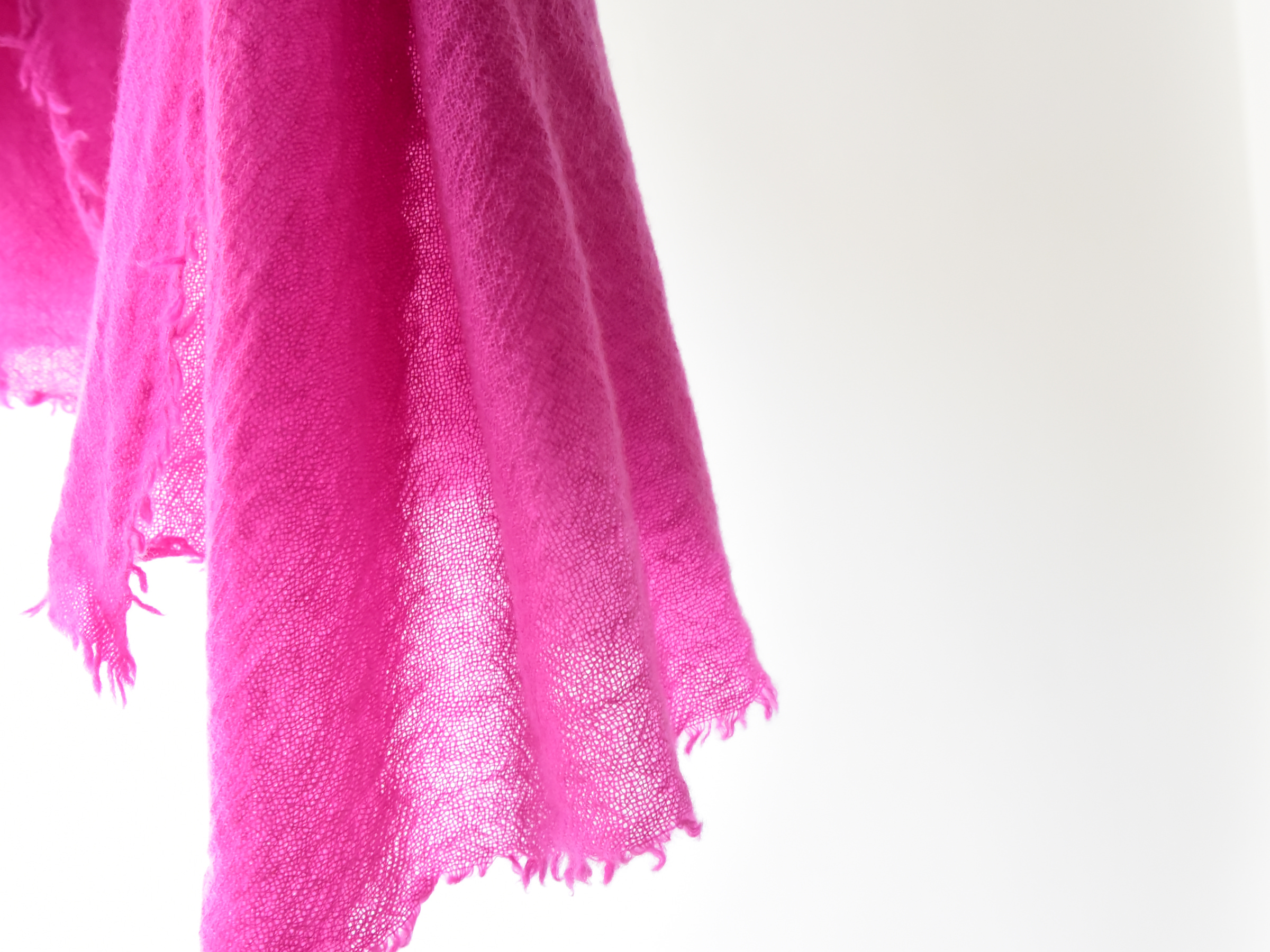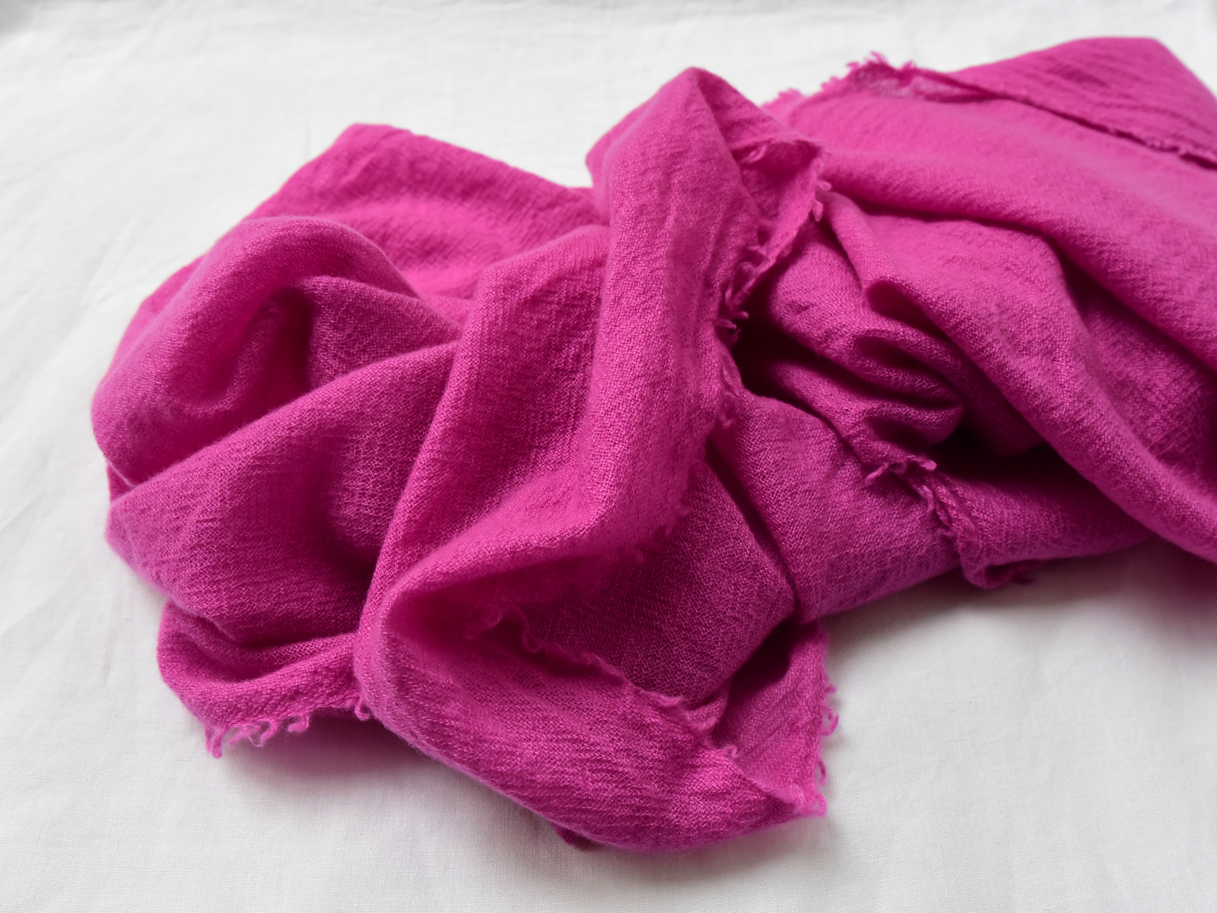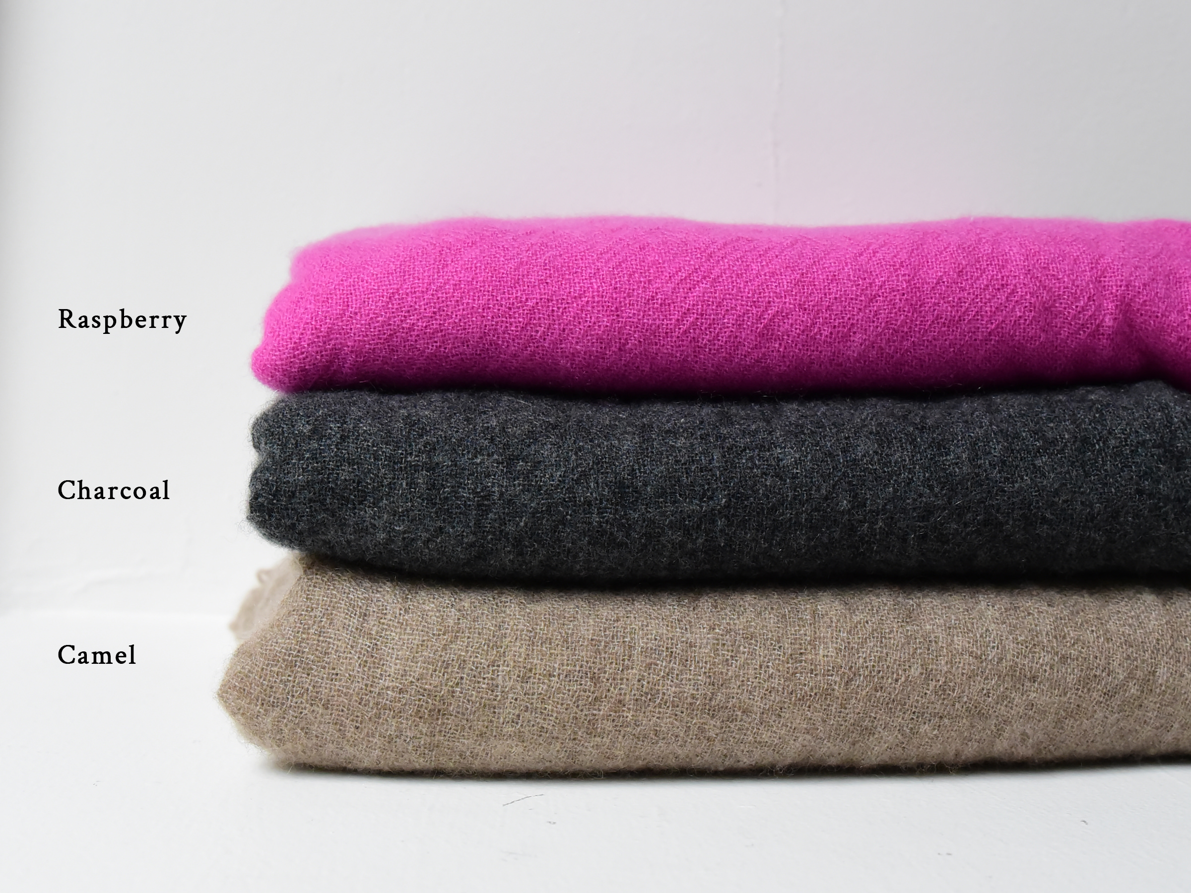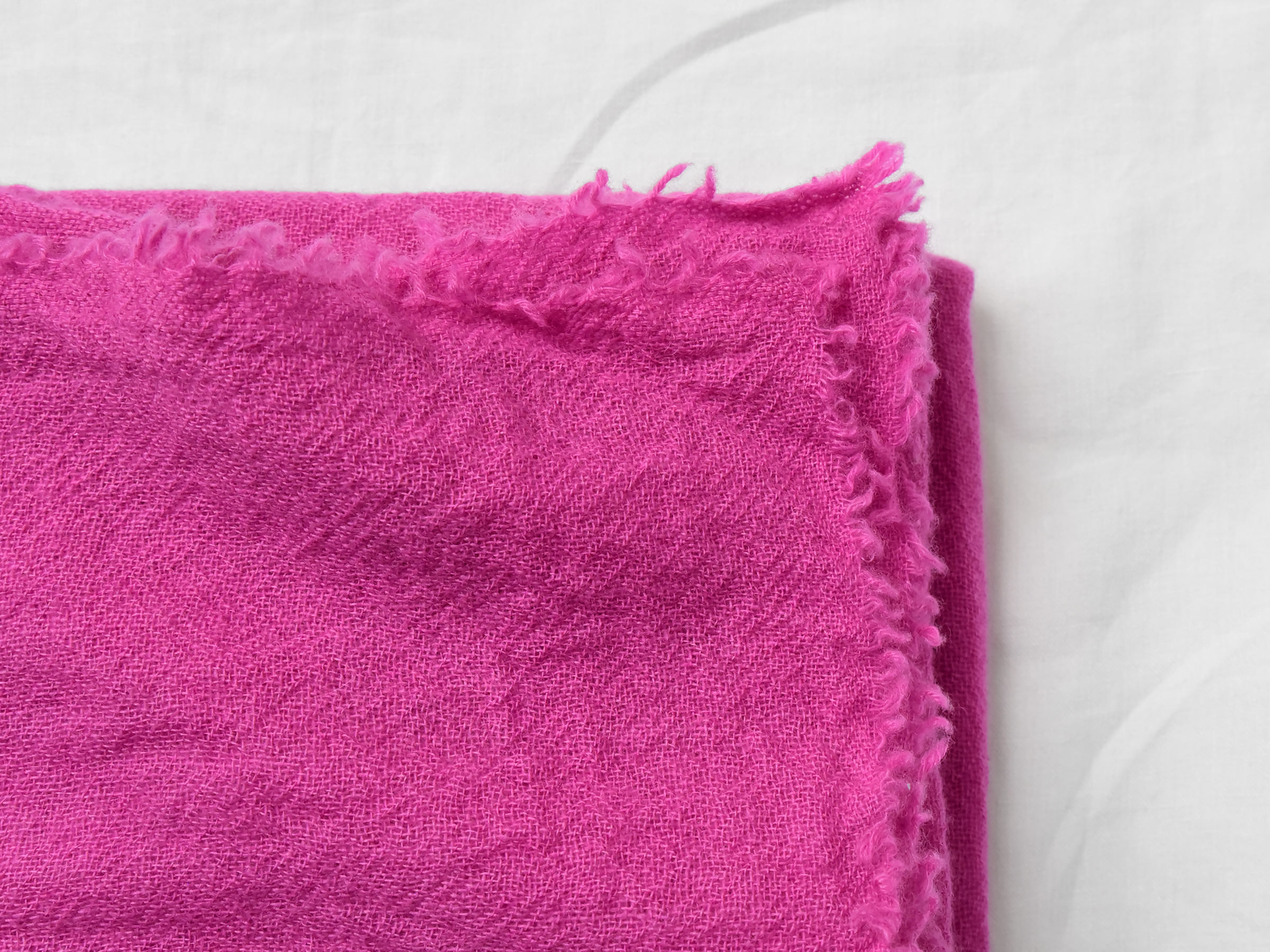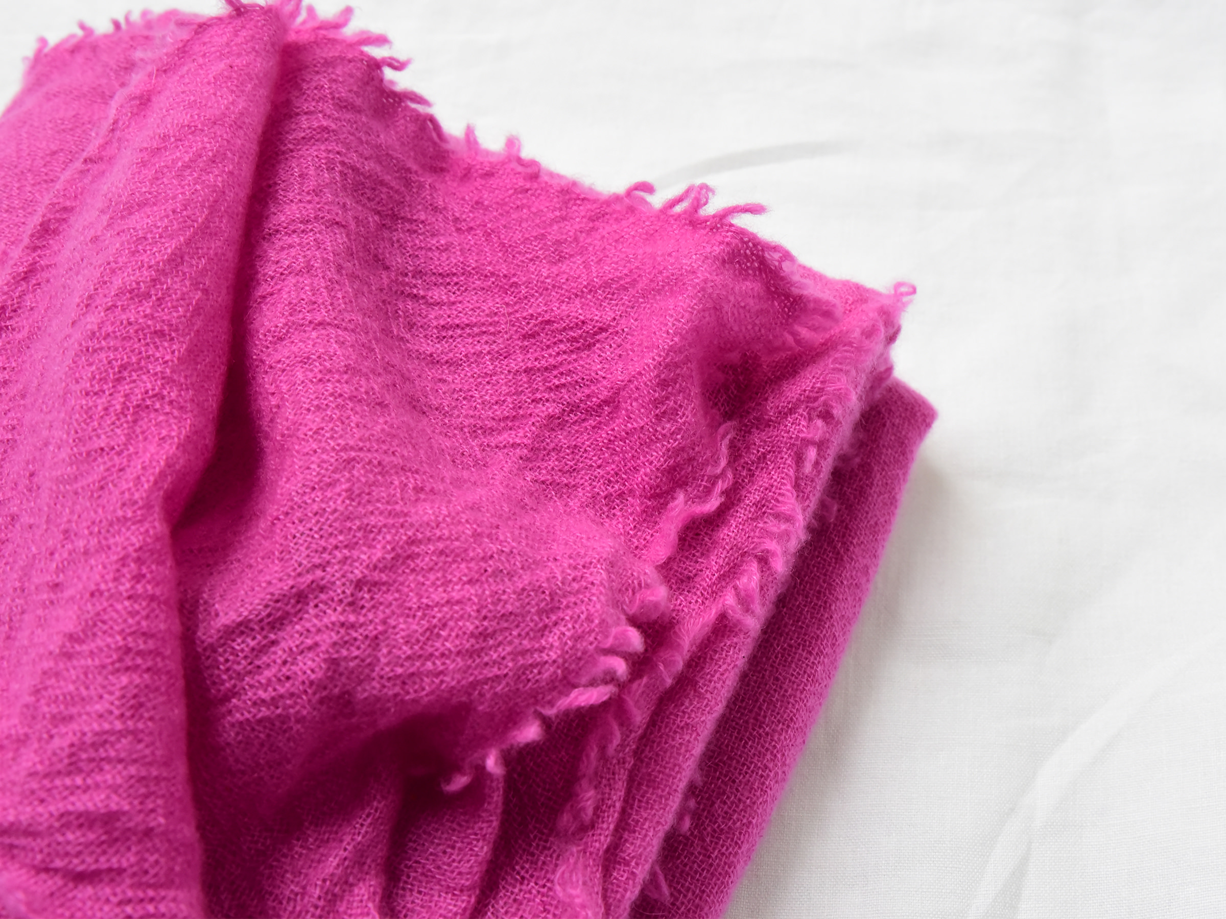 ※軽くて薄いカシミヤを使用し、プレウォッシュ加工でさらに柔らかな肌触りを実現。縁には短いフリンジが施され、大判サイズなので首に心地よく巻くのに最適です。