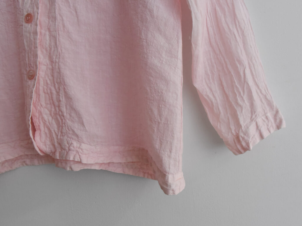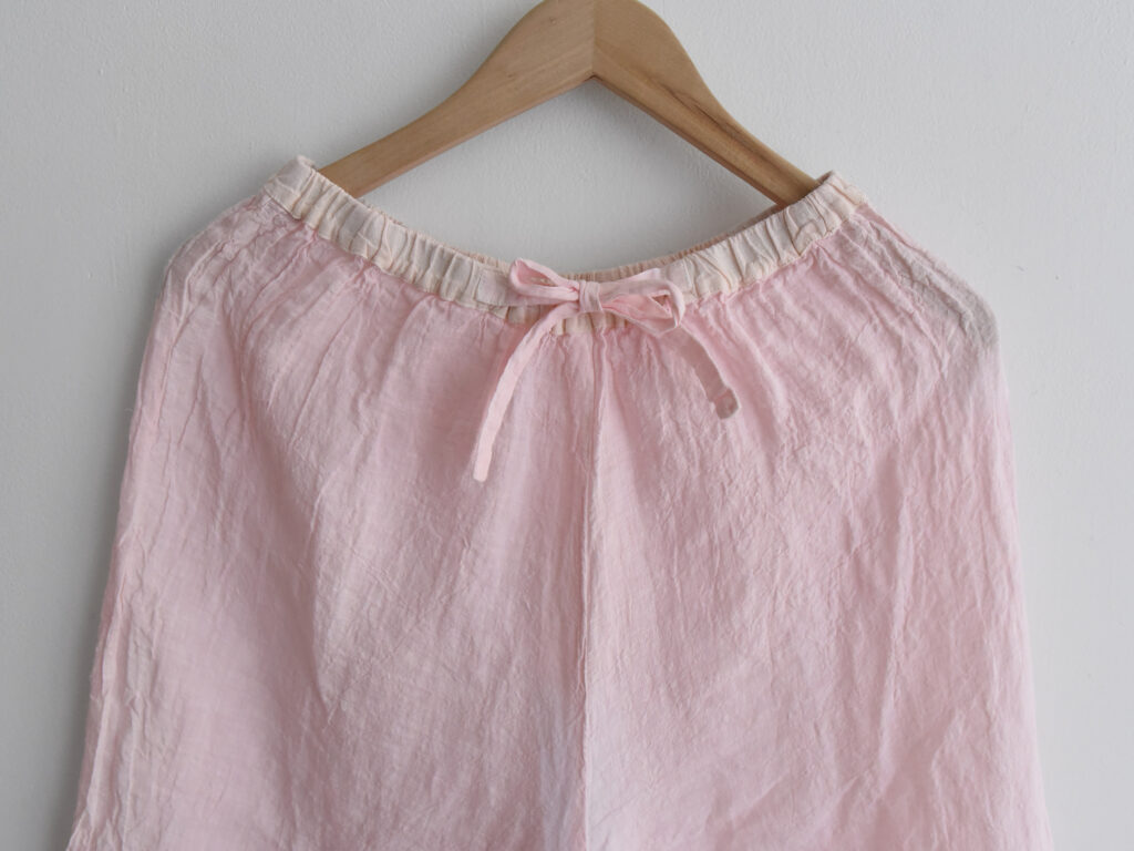 ※透け感のある軽やかなリネンパジャマセット。トップスは襟あり胸ポケット付き。パンツは伸縮性のあるウエストバンドとドローストリングで調節可。