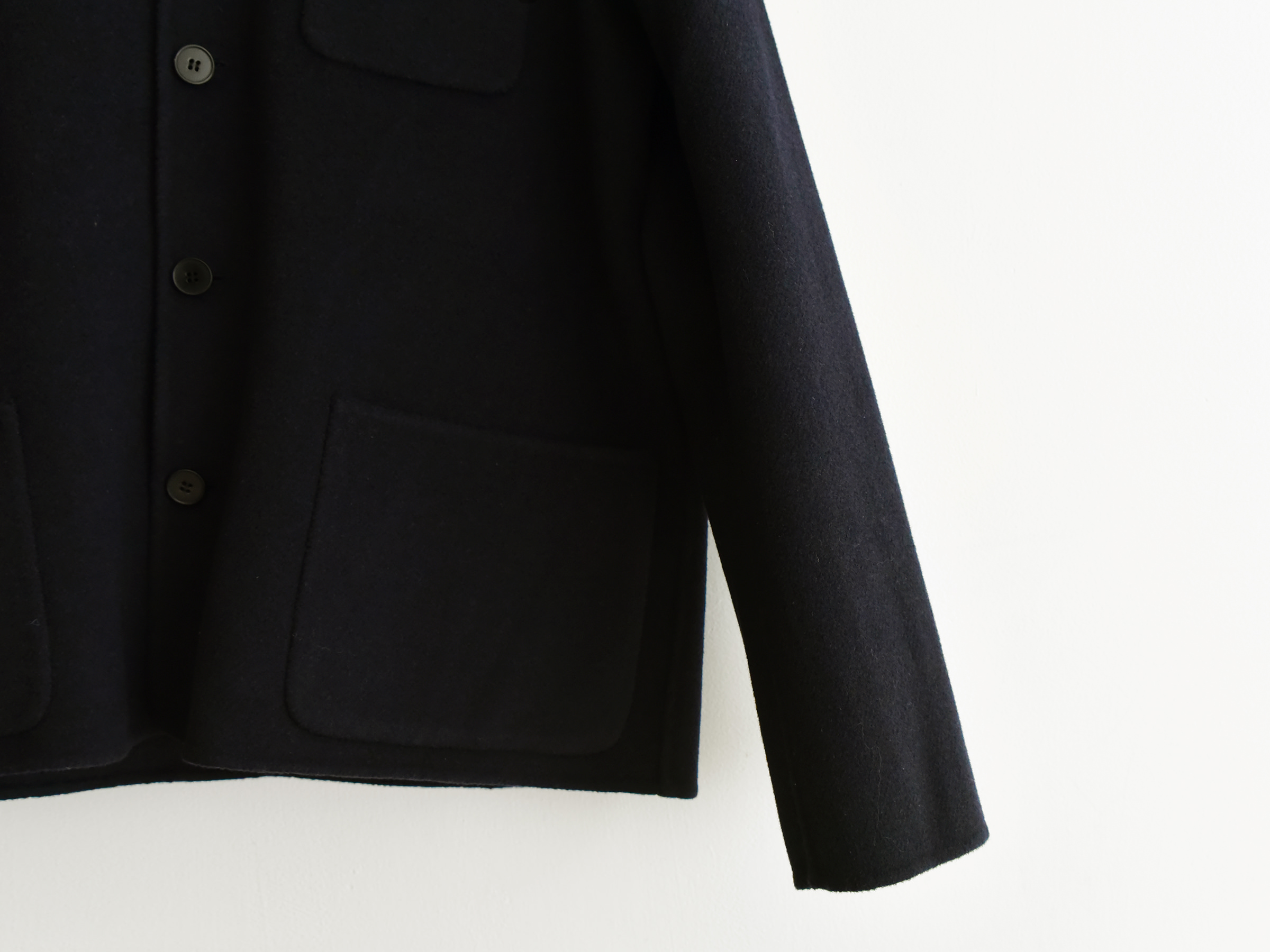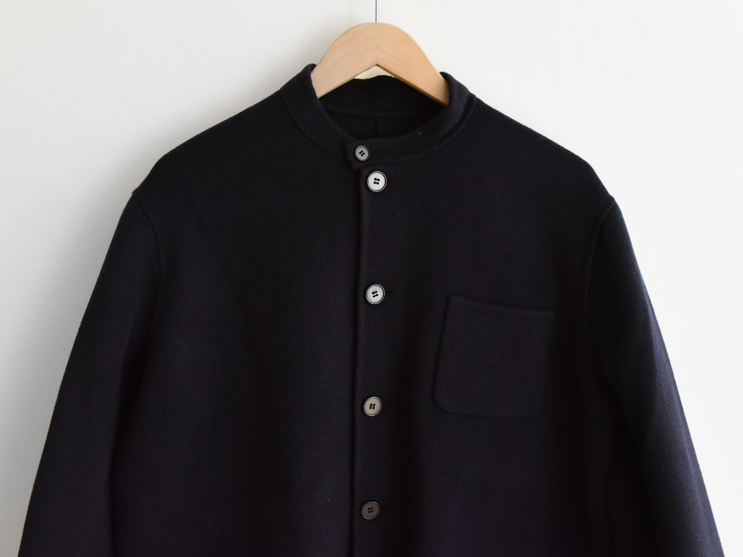 ※スタンドカラーデザインで、サイドポケットが2つ、胸ポケットが1つ付き。背中はシングルベントが仕様。