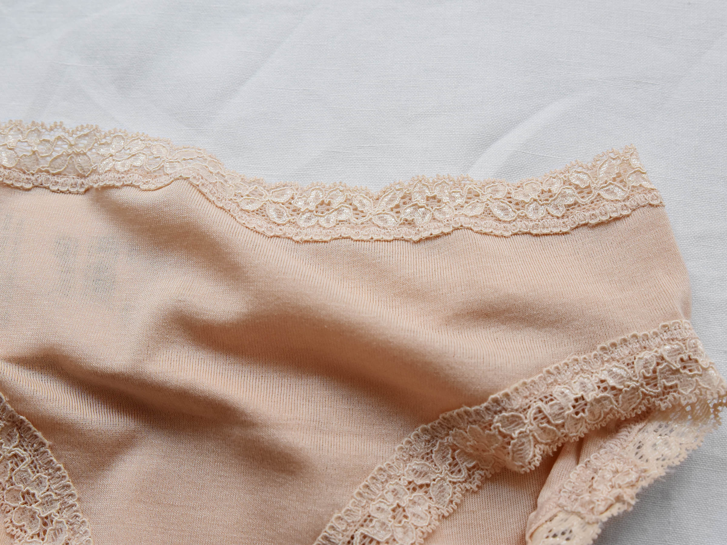 ウエストと脚まわりには、真正な“Dentelle de Calais®”として認証・管理番号付きのフランス製リバーレースを贅沢に使用。