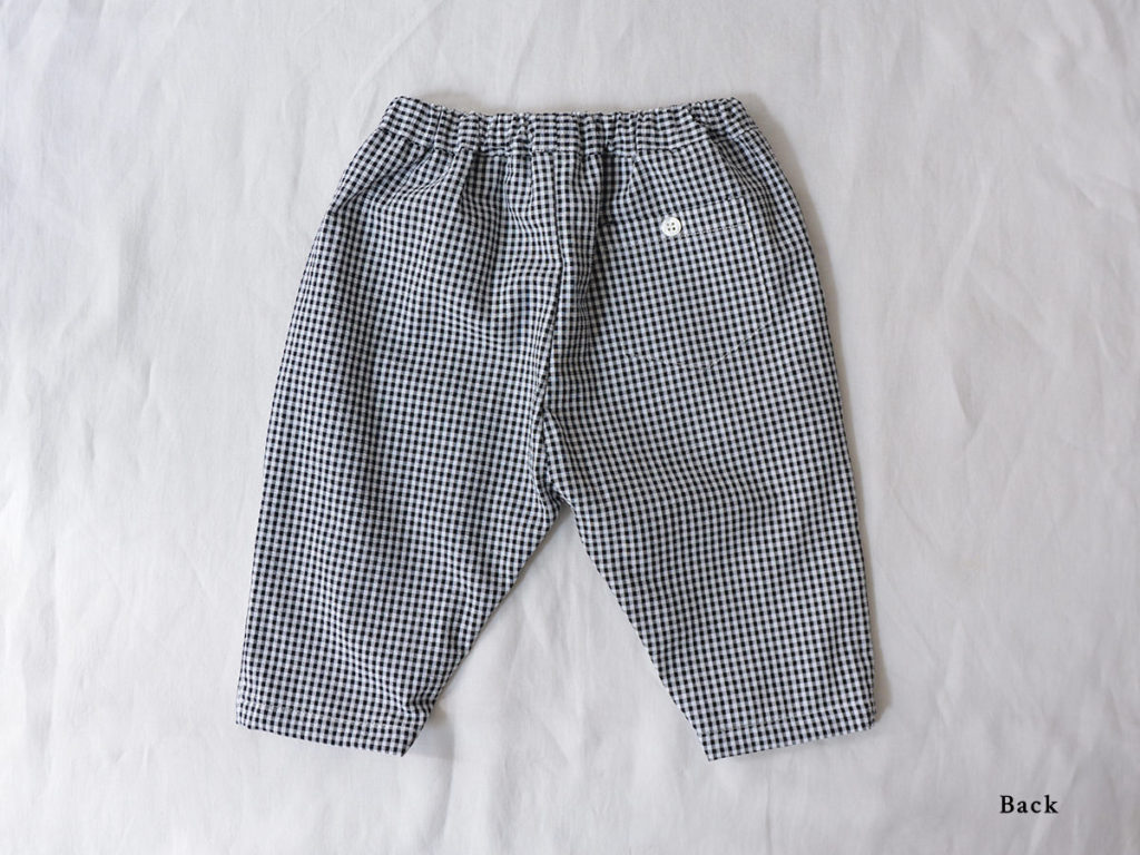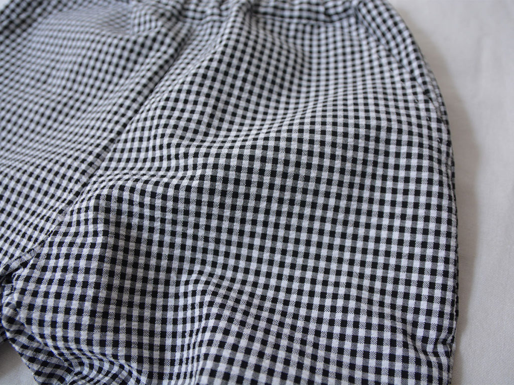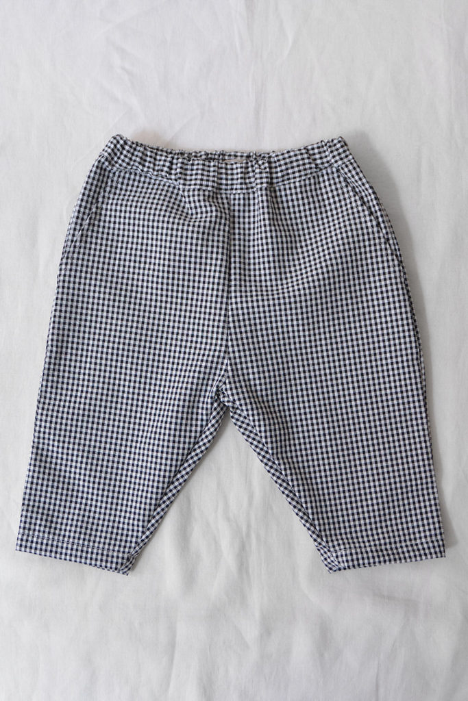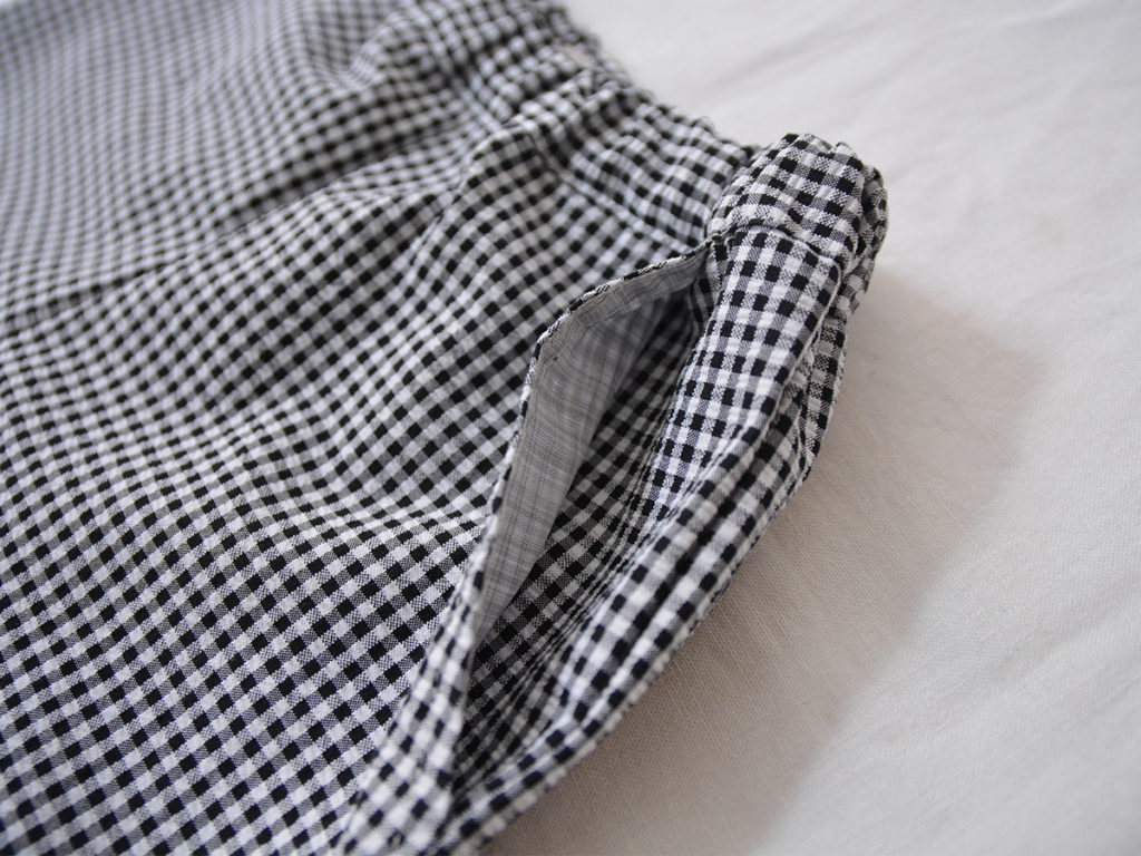 ショート丈のパンツです。 ライトグレーのチェックの裏地のついたサイドポケット2つ、バックポケット1つ。