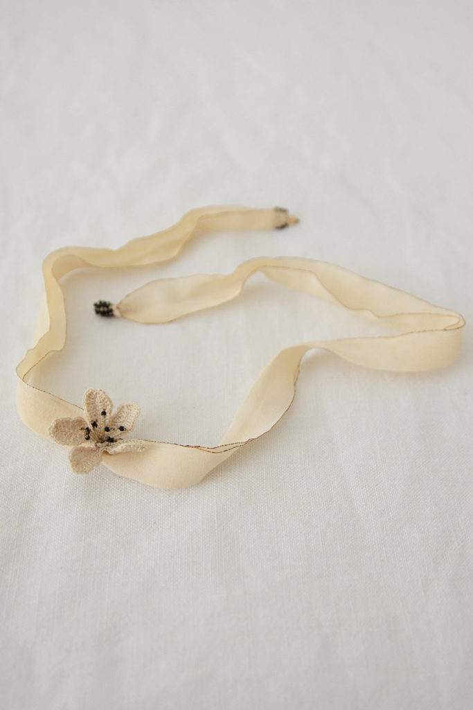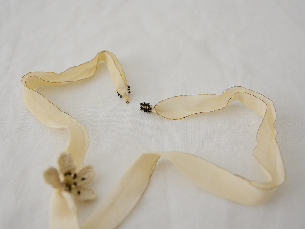 花びらは1枚1枚手編みで、おしべとめしべにはアンティークビーズとダイヤモンドが使われており、手首に巻くリボンはシルク製。