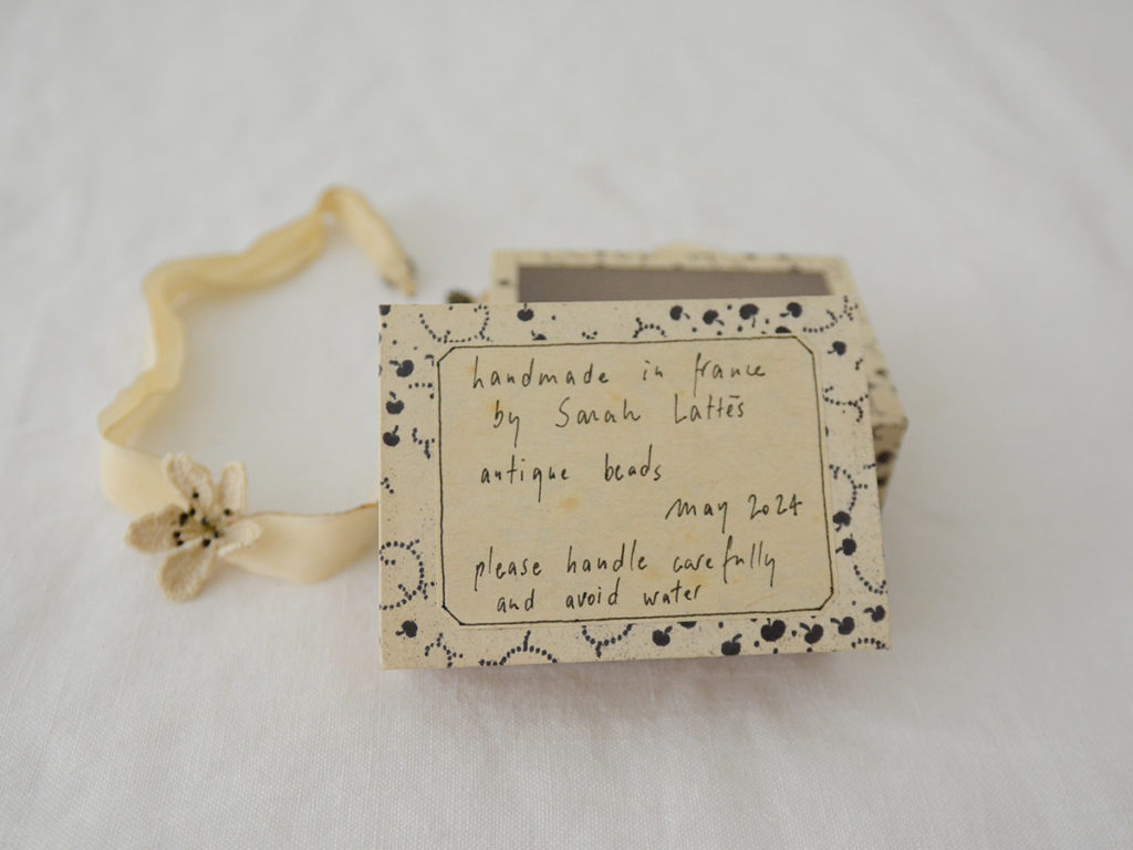 チョーカー/ブレスレットが入っている小さな箱もサラ・ラテスによる手作りです。