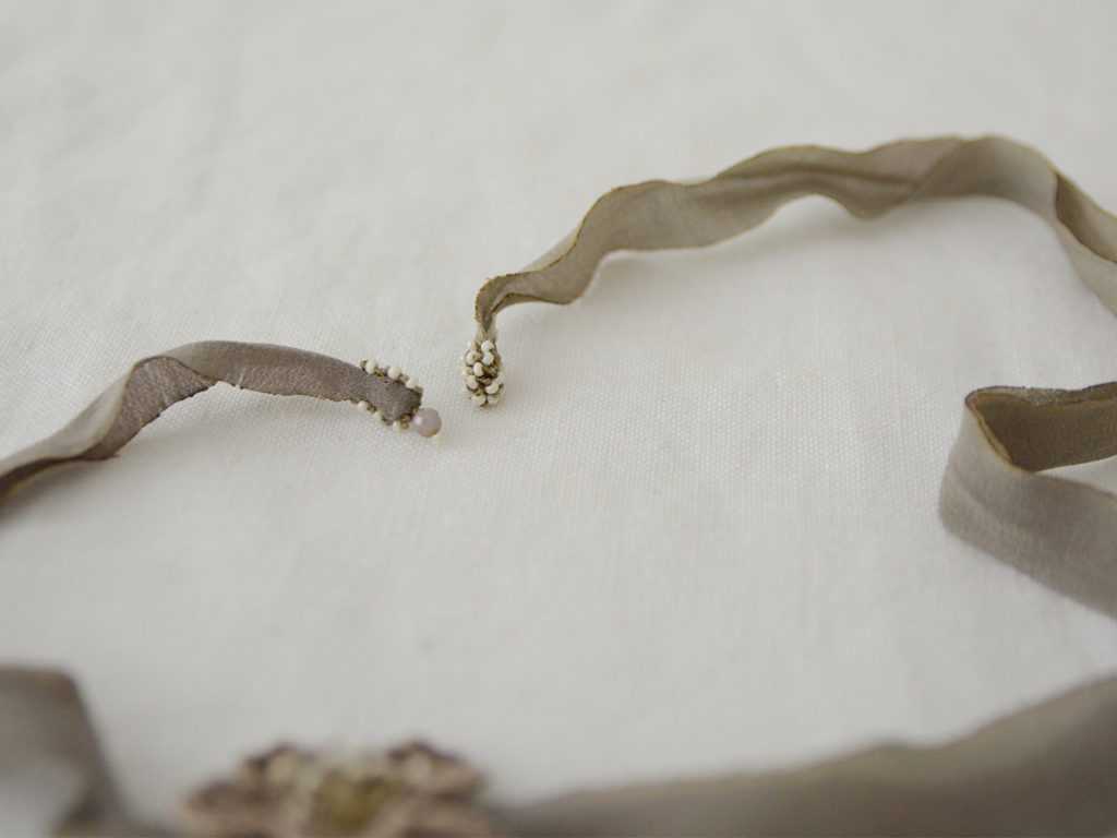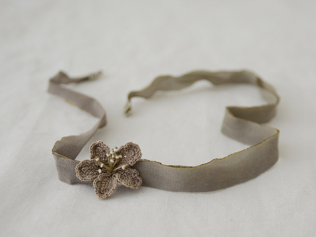 花びらは1枚1枚手編みで、おしべとめしべにはアンティークビーズとダイヤモンドが使われており、手首に巻くリボンはシルク製。