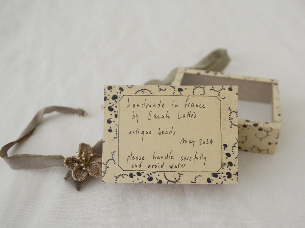 チョーカー/ブレスレットが入っている小さな箱もサラ・ラテスによる手作りです。