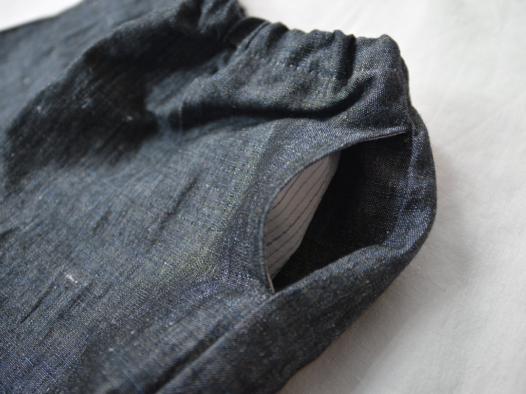 ブルーのストライプの裏地付きのサイドポケットと、バックポケットがひとつ付いています。