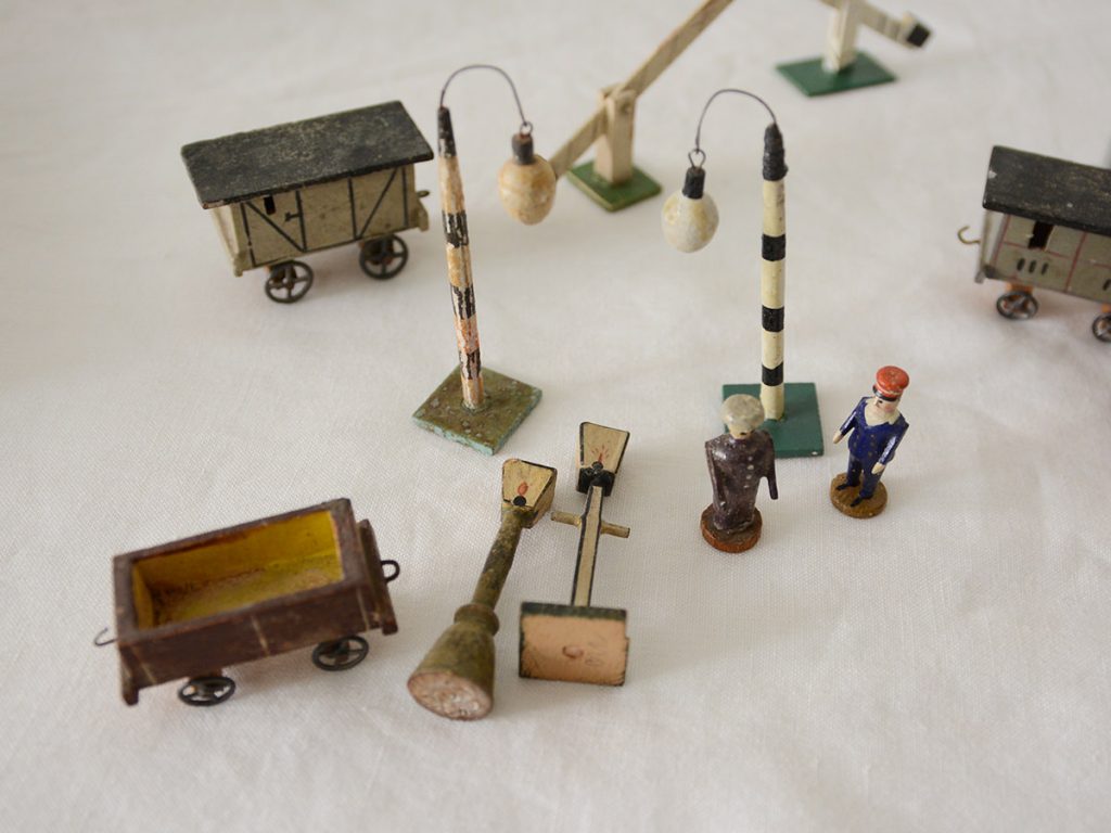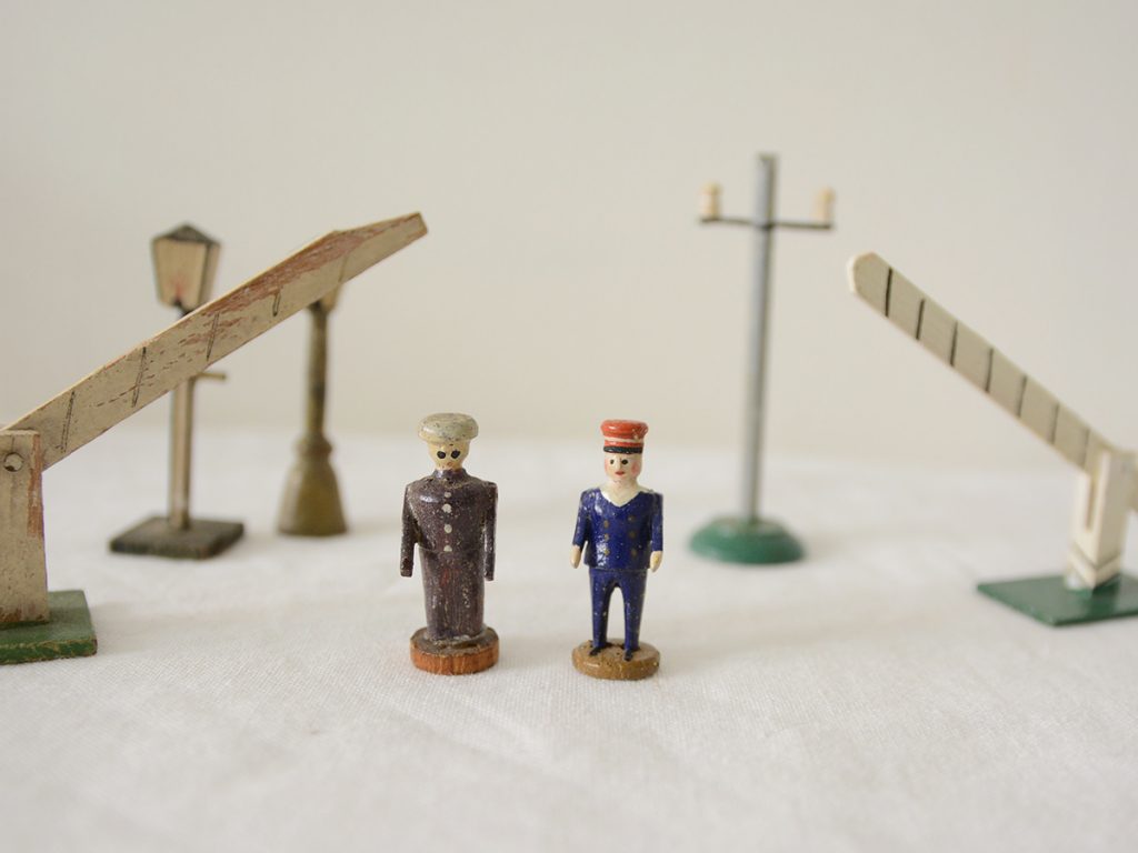 ※2 station staffs, 4 trains, 2 gas lights, 1 train electric tower, 2 lights, and 2 rail road crossing.