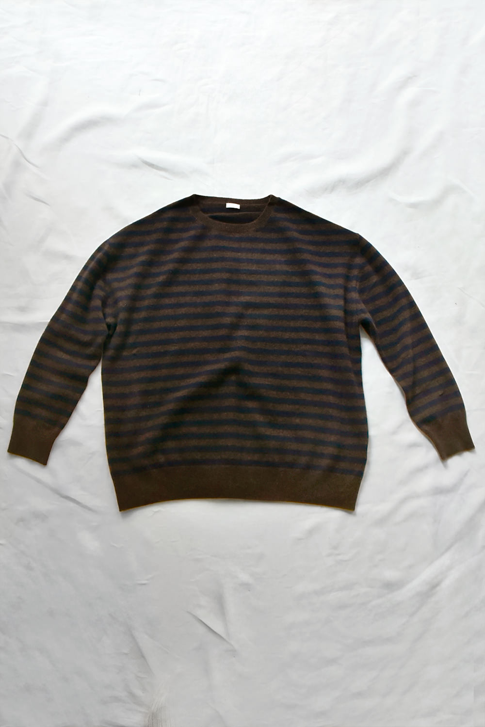 MAKIE / マキエ, Cashmere Round Neck Sweater – Navy x Brown Stripe